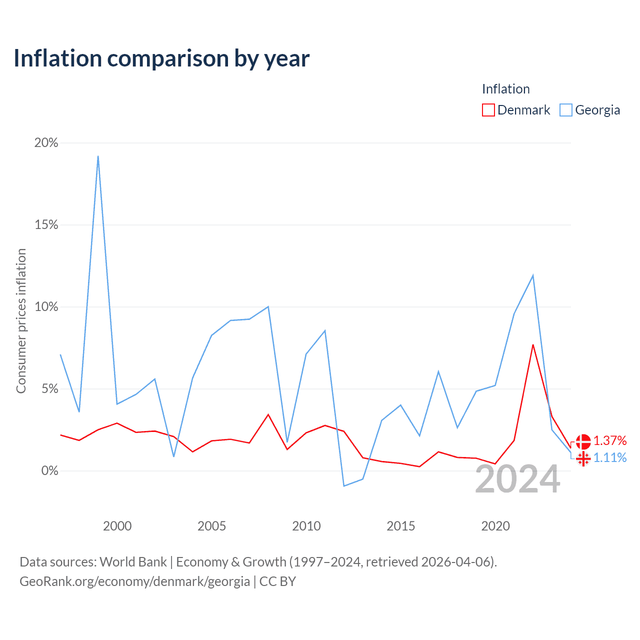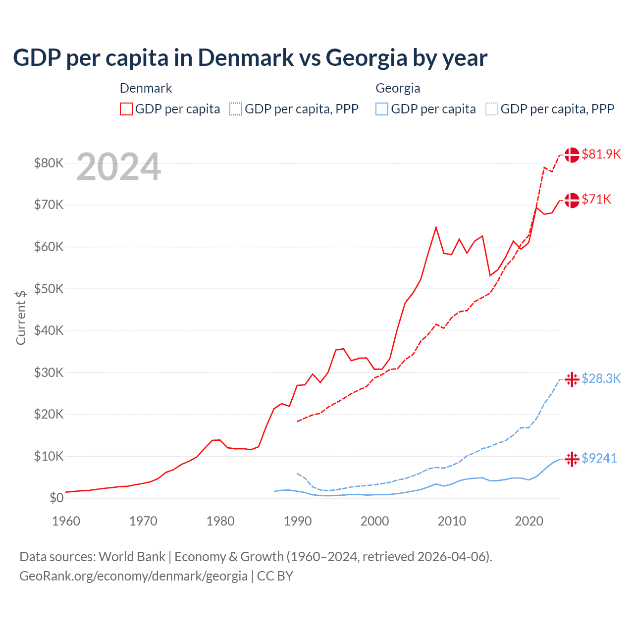 Denmark has a GDP of $425B compared to $34.2B for Georgia, ranking 37/197 and 107/197 by economy size, respectively.