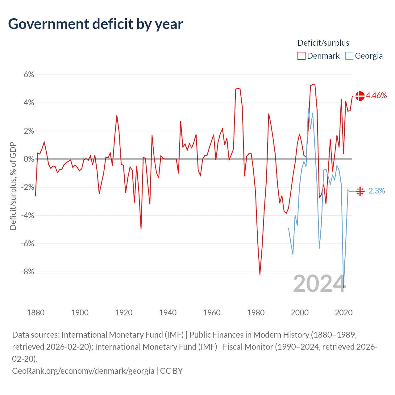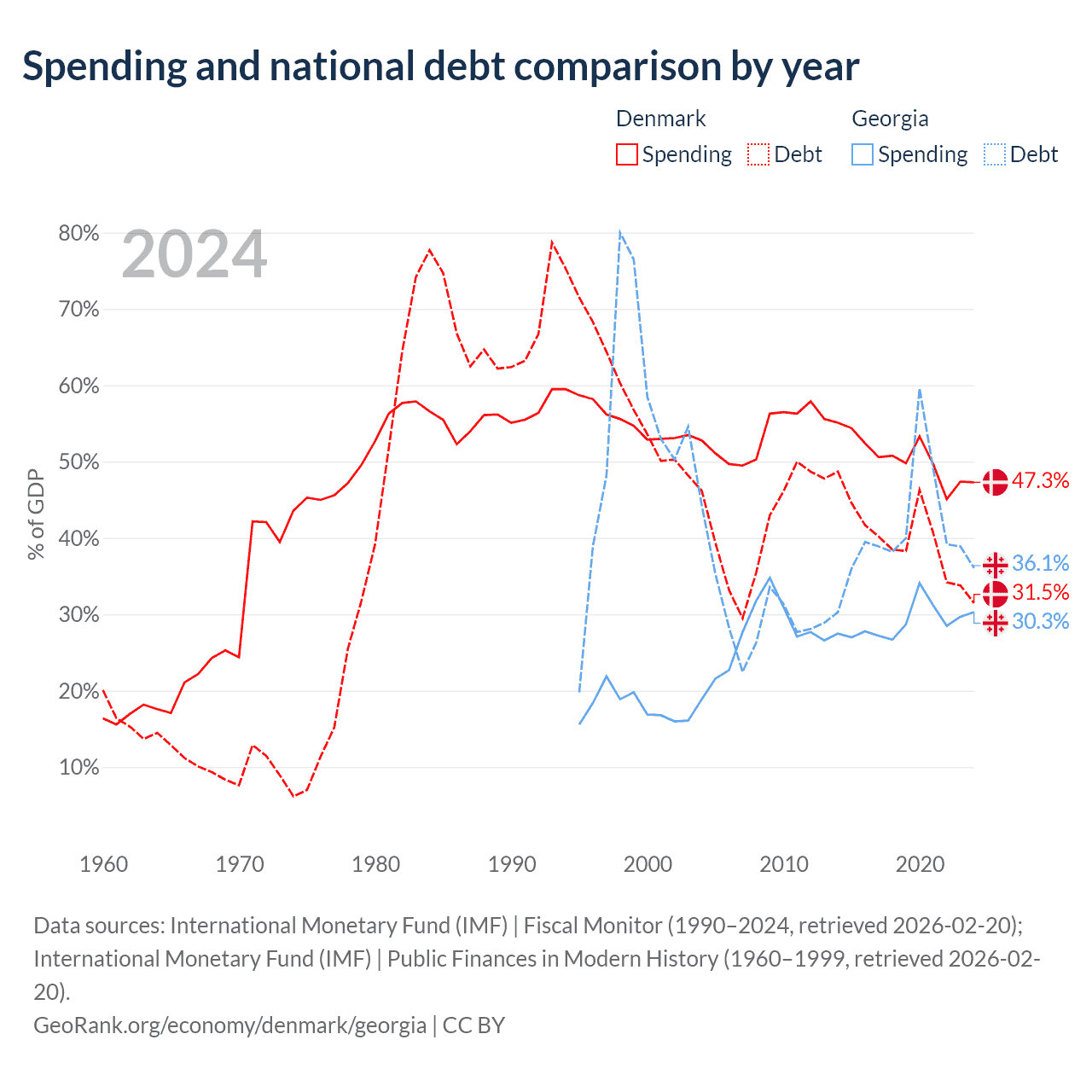 Denmark has $134B in government debt (31.5% of GDP), compared to $12.3B (36.1% of GDP) in Georgia.