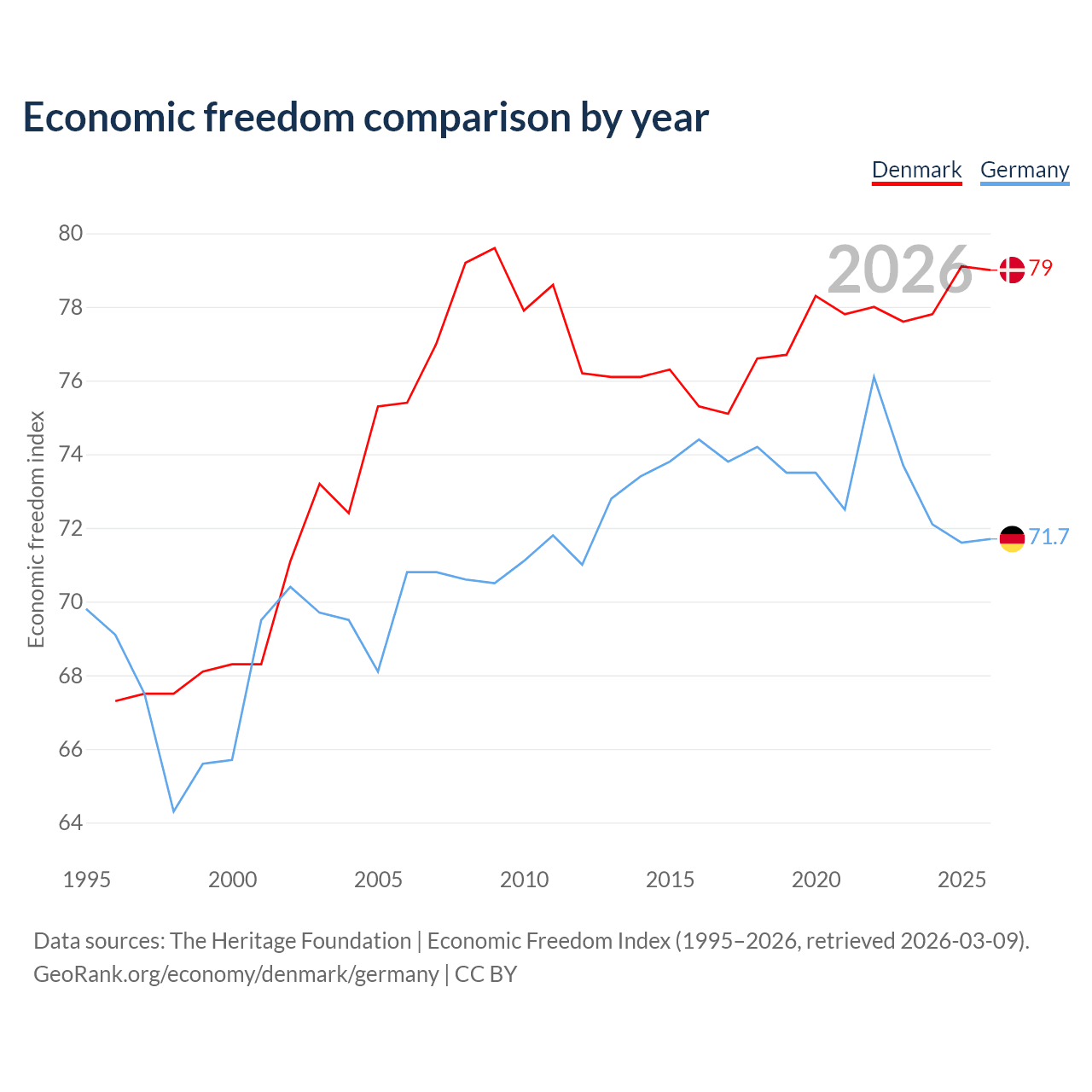 The Economic Freedom Index for Denmark is 79, ranking 8/197, compared to 71.7 for Germany, ranking 30/197. The chart above displays a comparison of annual changes in economic freedom indexes.