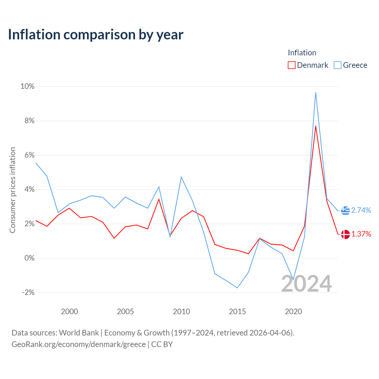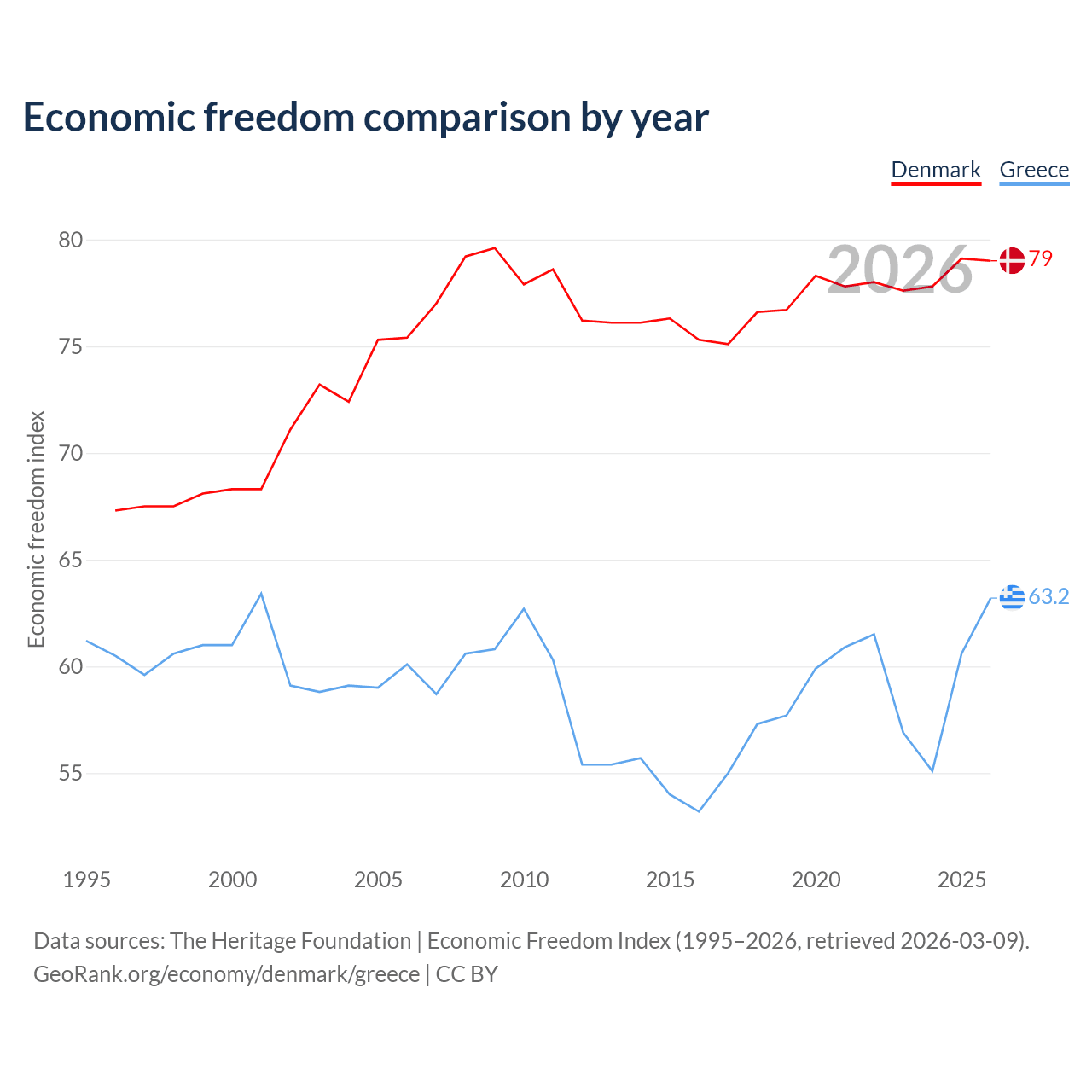 The Economic Freedom Index for Denmark is 79, ranking 8/197, compared to 63.2 for Greece, ranking 82/197. The chart above displays a comparison of annual changes in economic freedom indexes.