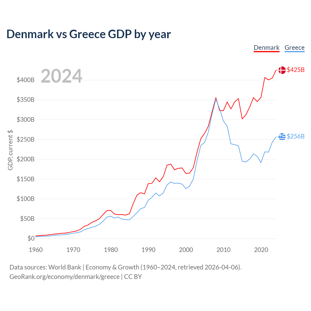 Denmark has a GDP of $425B compared to $256B for Greece, ranking 37/197 and 53/197 by economy size, respectively.
