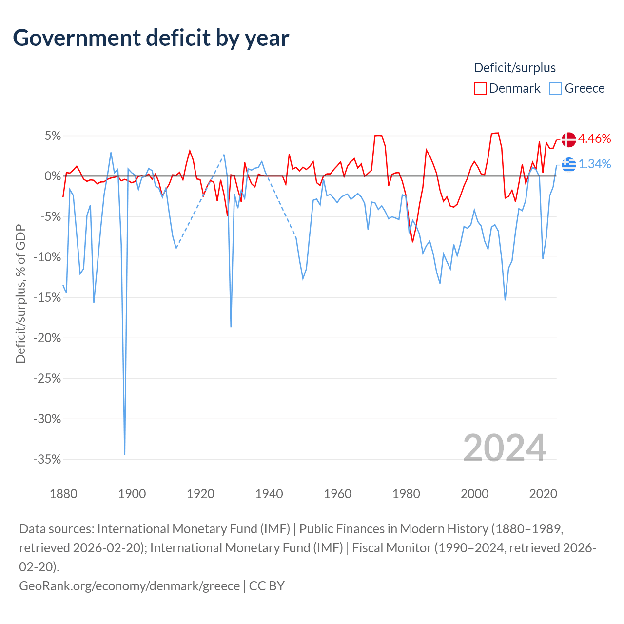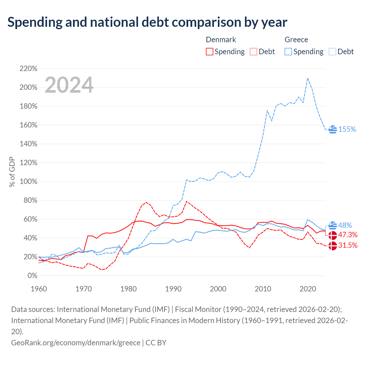 Denmark has $134B in government debt (31.5% of GDP), compared to $397B (154.8% of GDP) in Greece.