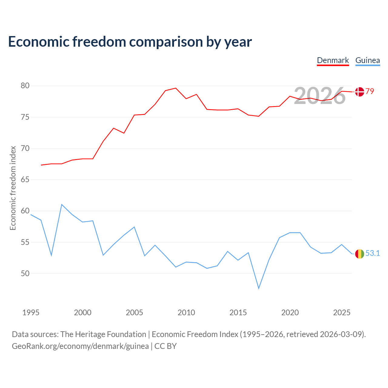 The Economic Freedom Index for Denmark is 79, ranking 8/197, compared to 53.1 for Guinea, ranking 141/197. The chart above displays a comparison of annual changes in economic freedom indexes.