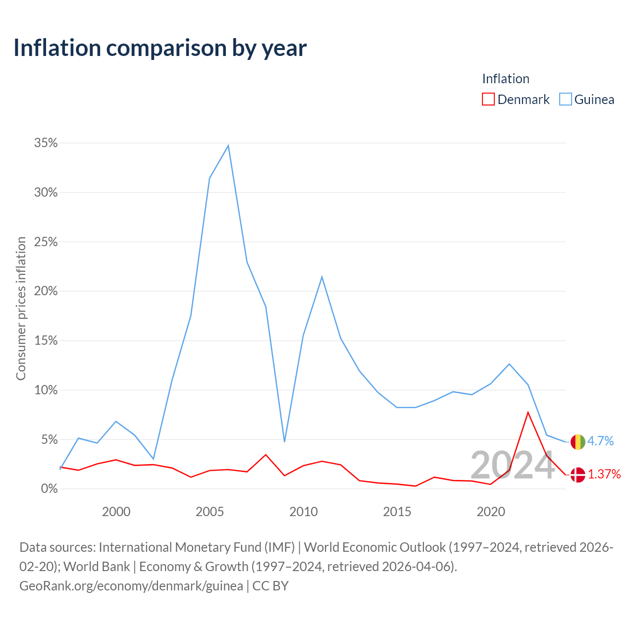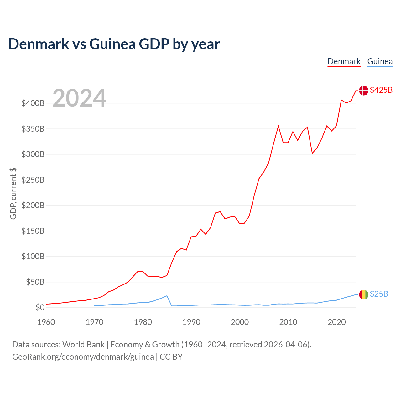 Denmark has a GDP of $425B compared to $25B for Guinea, ranking 37/197 and 118/197 by economy size, respectively.