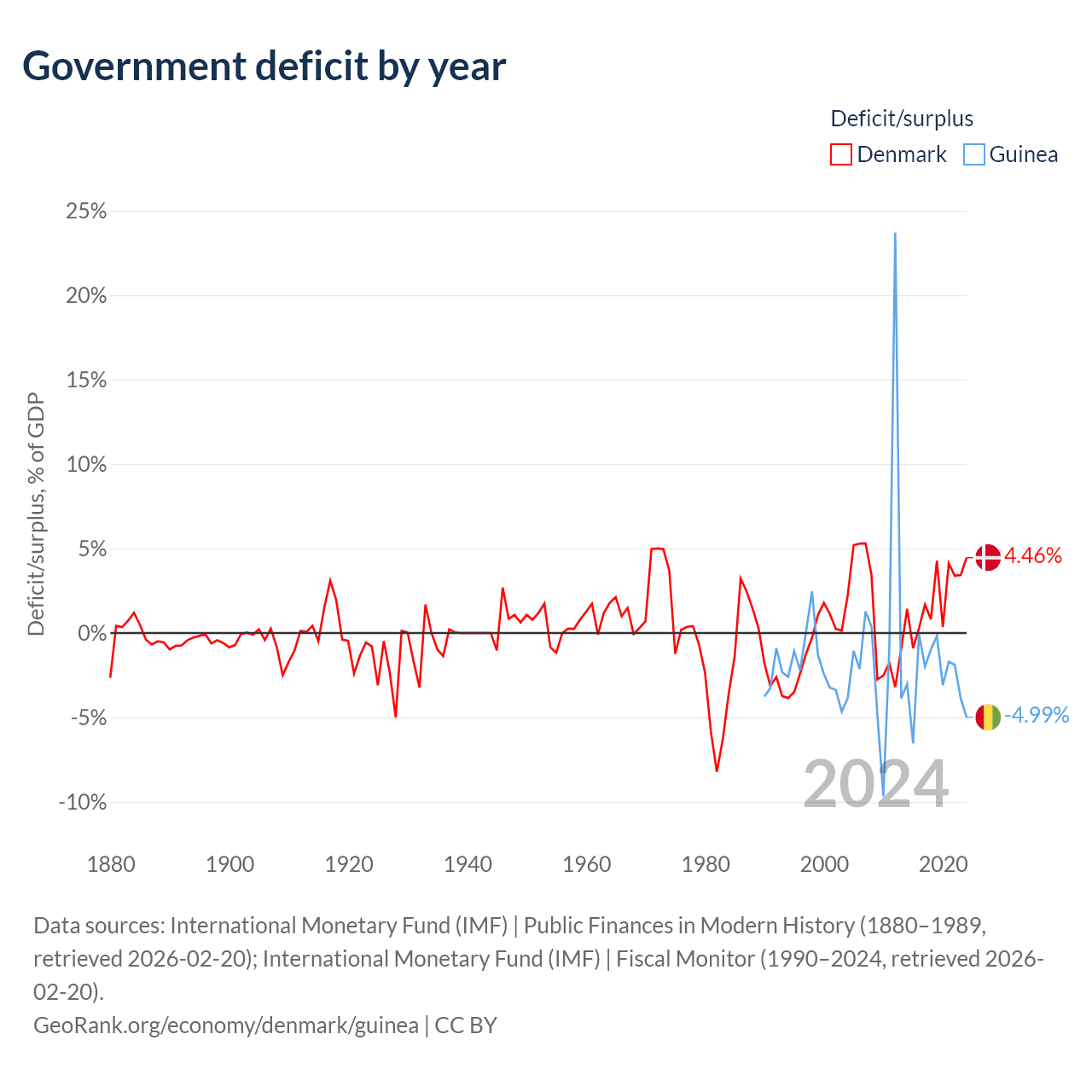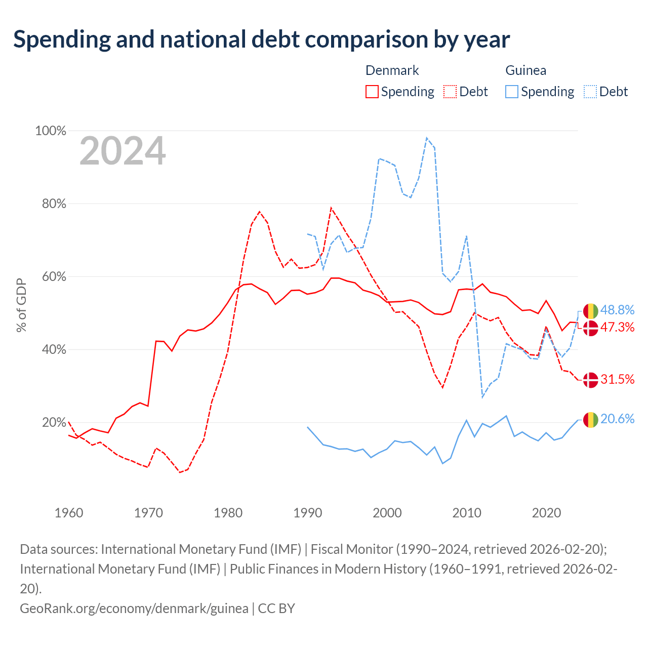Denmark has $134B in government debt (31.5% of GDP), compared to $12.2B (48.8% of GDP) in Guinea.