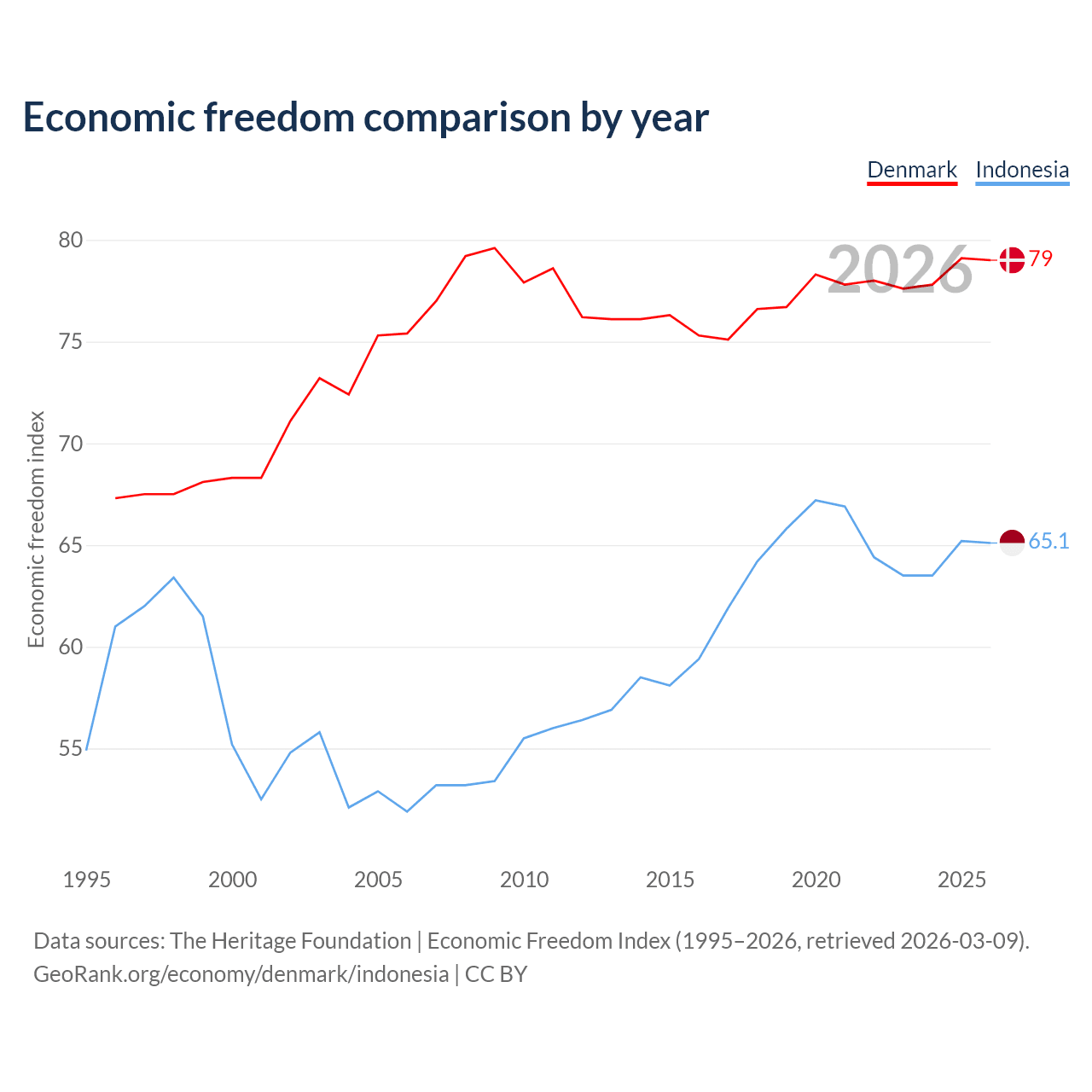 The Economic Freedom Index for Denmark is 79, ranking 8/197, compared to 65.1 for Indonesia, ranking 67/197. The chart above displays a comparison of annual changes in economic freedom indexes.