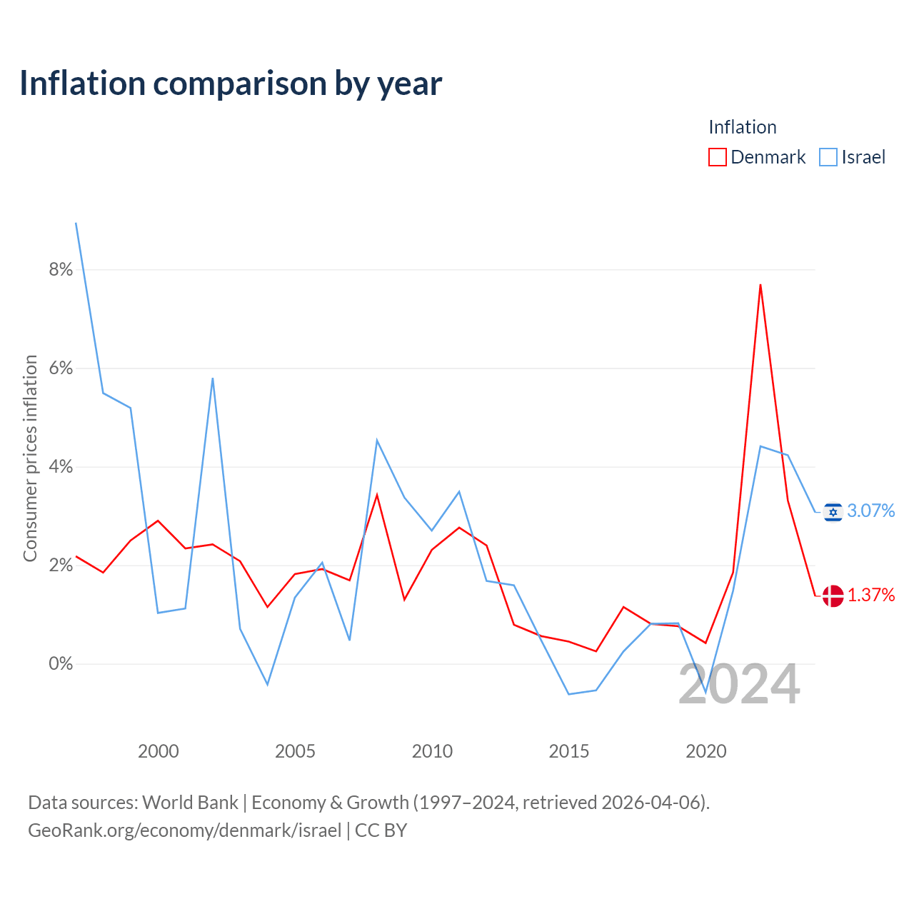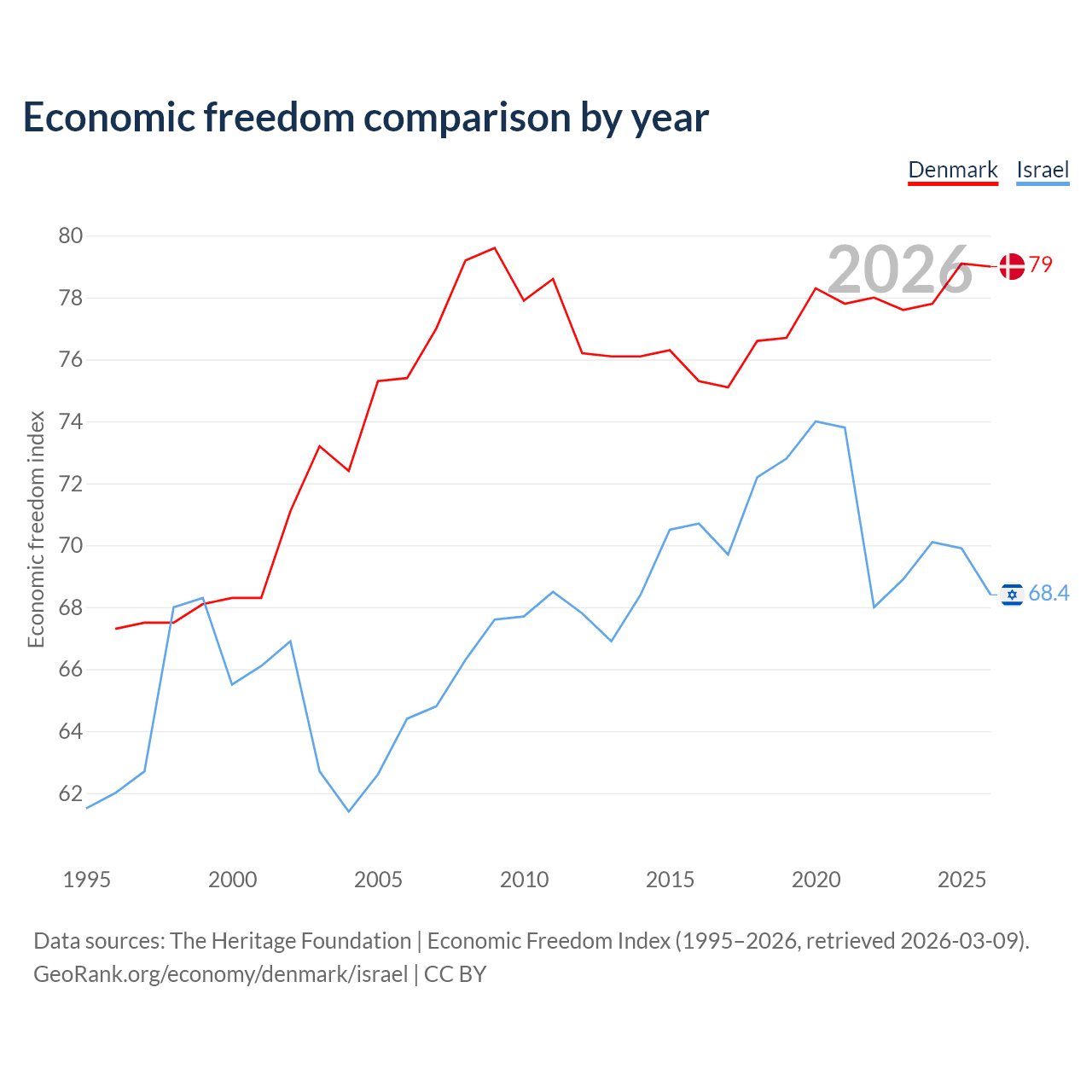 The Economic Freedom Index for Denmark is 79, ranking 8/197, compared to 68.4 for Israel, ranking 47/197. The chart above displays a comparison of annual changes in economic freedom indexes.