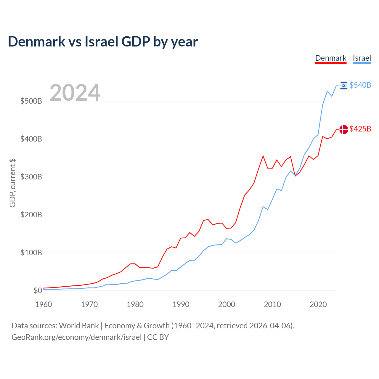 Denmark has a GDP of $425B compared to $540B for Israel, ranking 37/197 and 29/197 by economy size, respectively.