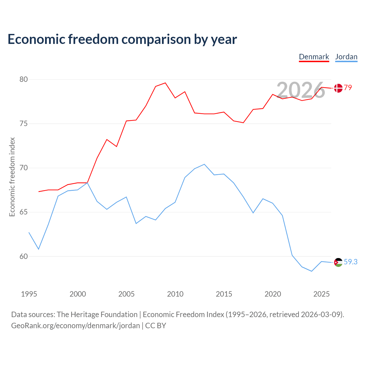 The Economic Freedom Index for Denmark is 79, ranking 8/197, compared to 59.3 for Jordan, ranking 104/197. The chart above displays a comparison of annual changes in economic freedom indexes.