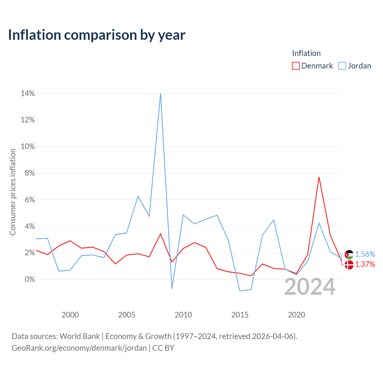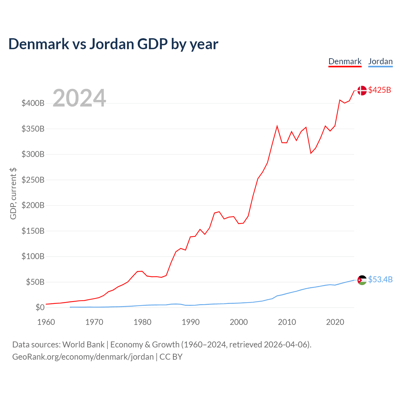 Denmark has a GDP of $425B compared to $53.4B for Jordan, ranking 37/197 and 90/197 by economy size, respectively.