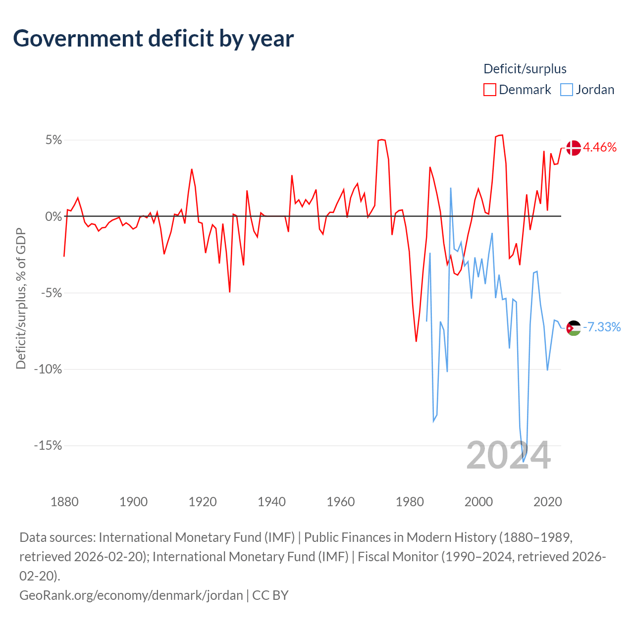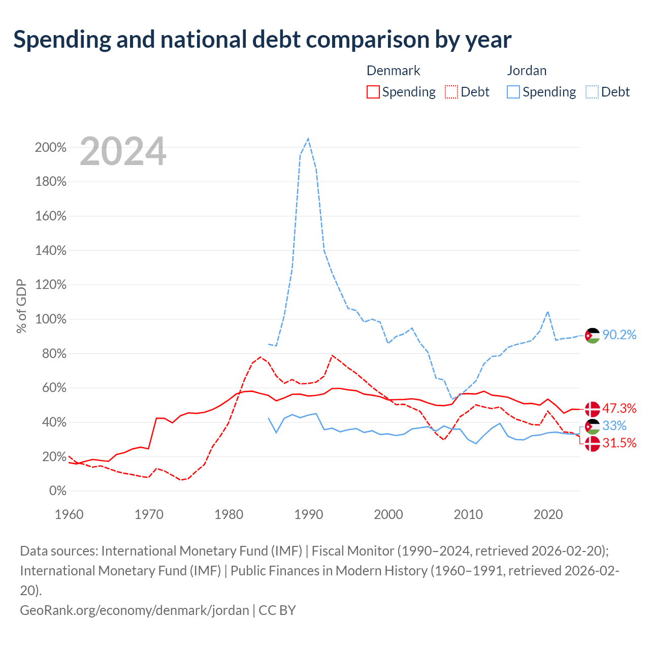 Denmark has $134B in government debt (31.5% of GDP), compared to $48.1B (90.2% of GDP) in Jordan.