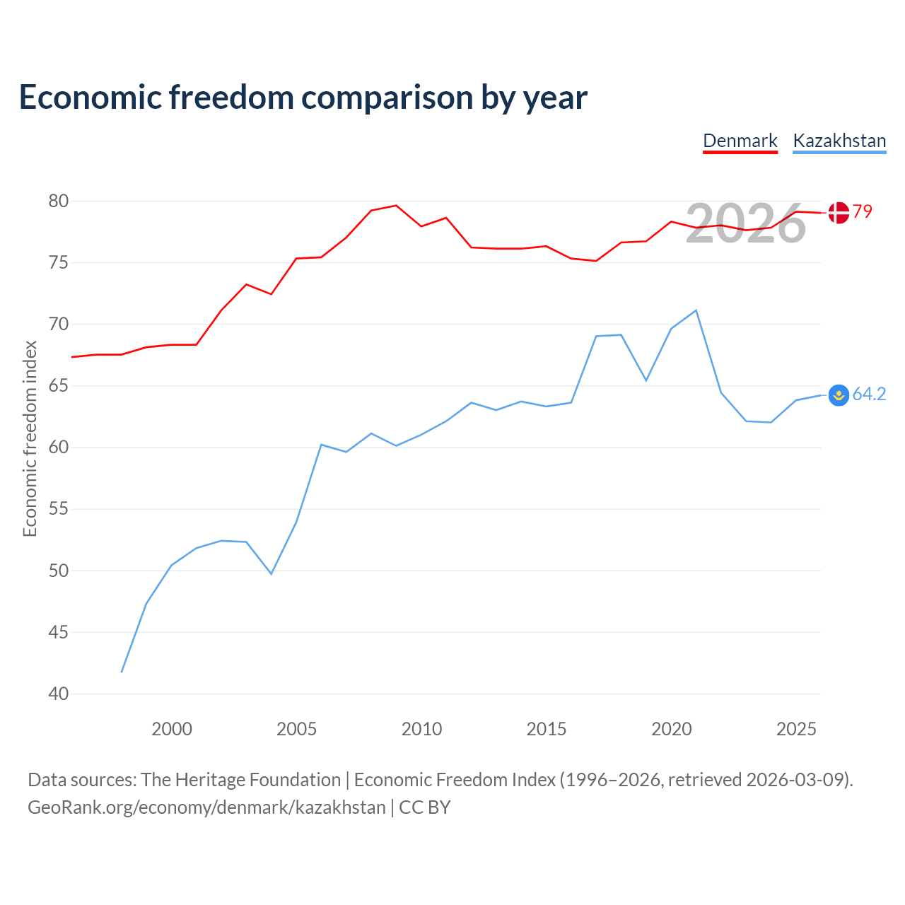 The Economic Freedom Index for Denmark is 79, ranking 8/197, compared to 64.2 for Kazakhstan, ranking 75/197. The chart above displays a comparison of annual changes in economic freedom indexes.