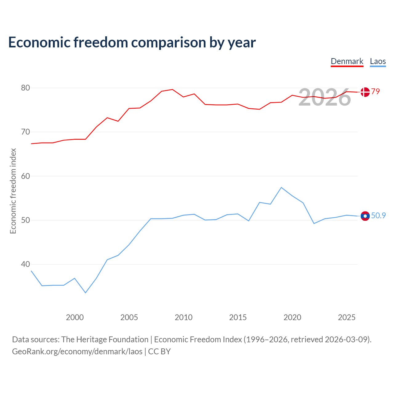 The Economic Freedom Index for Denmark is 79, ranking 8/197, compared to 50.9 for Laos, ranking 157/197. The chart above displays a comparison of annual changes in economic freedom indexes.