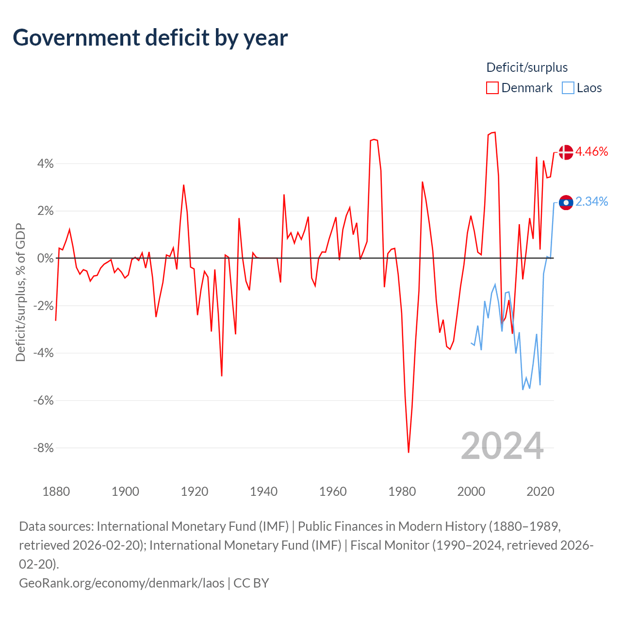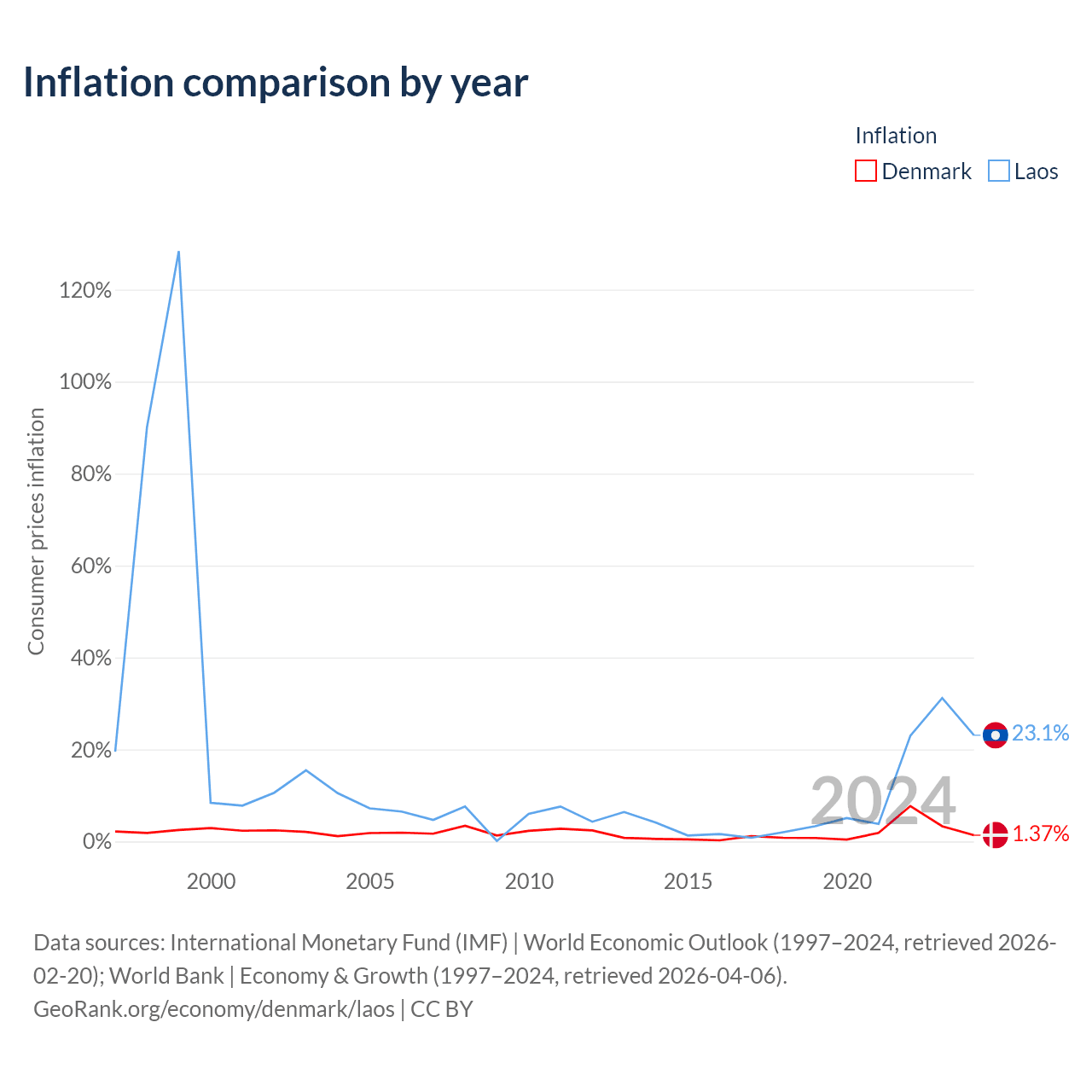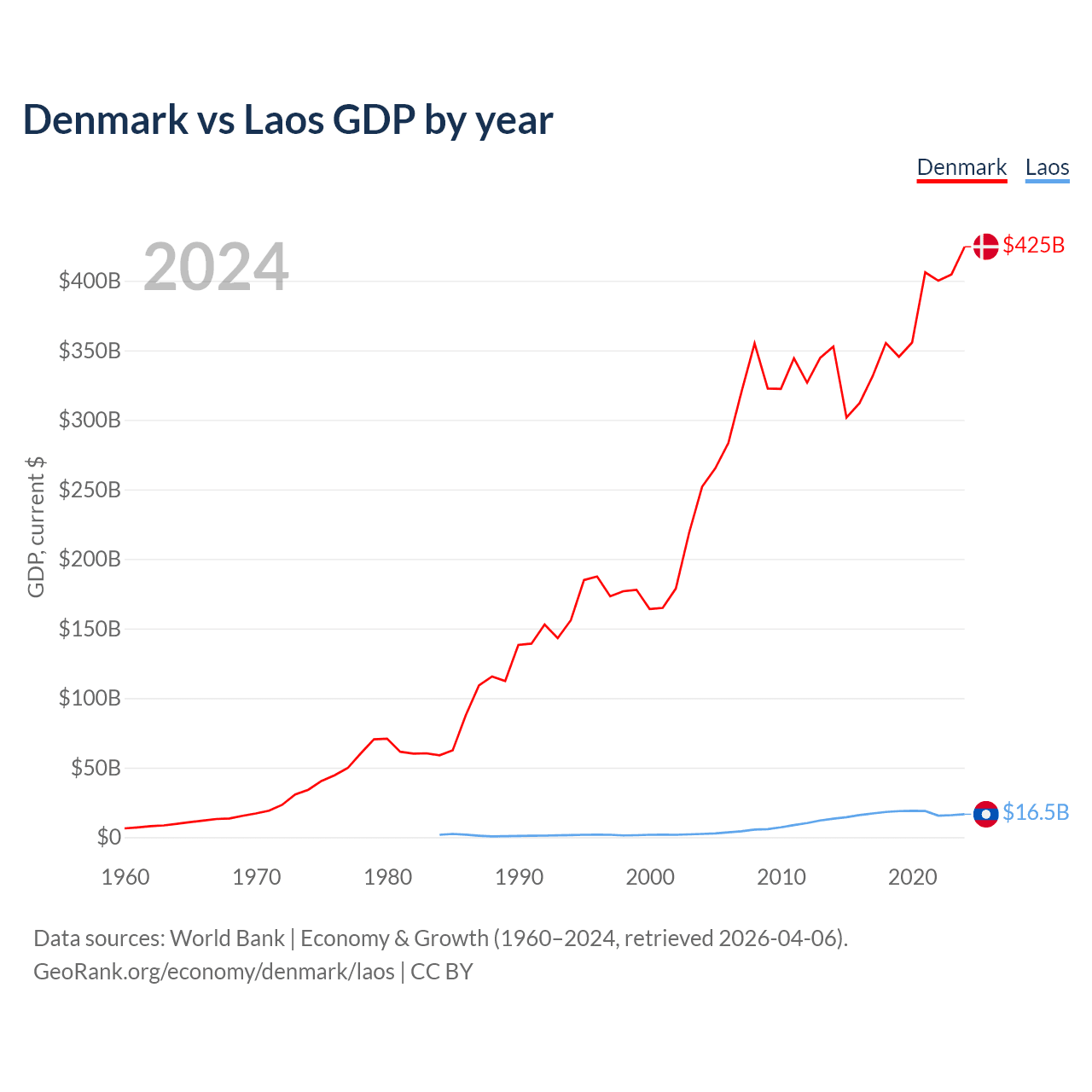 Denmark has a GDP of $425B compared to $16.5B for Laos, ranking 37/197 and 139/197 by economy size, respectively.