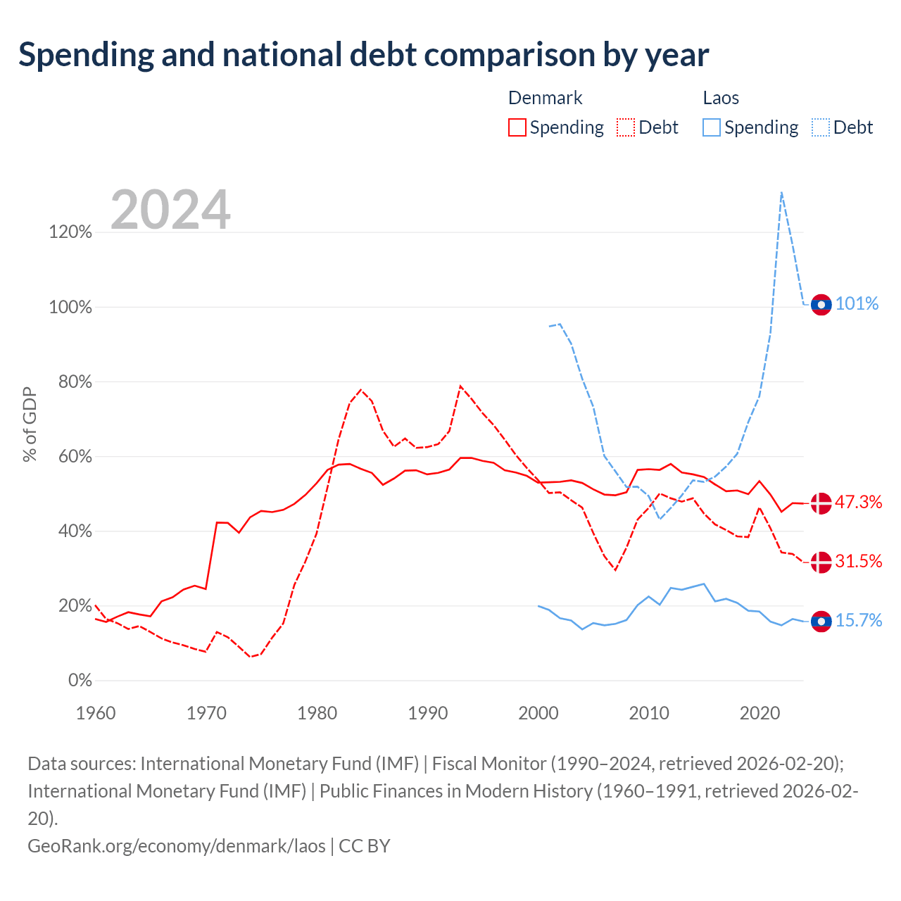 Denmark has $134B in government debt (31.5% of GDP), compared to $16.6B (100.5% of GDP) in Laos.