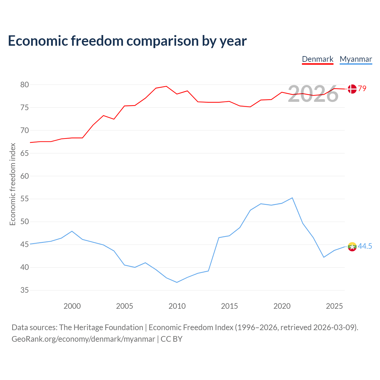 The Economic Freedom Index for Denmark is 79, ranking 8/197, compared to 44.5 for Myanmar, ranking 180/197. The chart above displays a comparison of annual changes in economic freedom indexes.