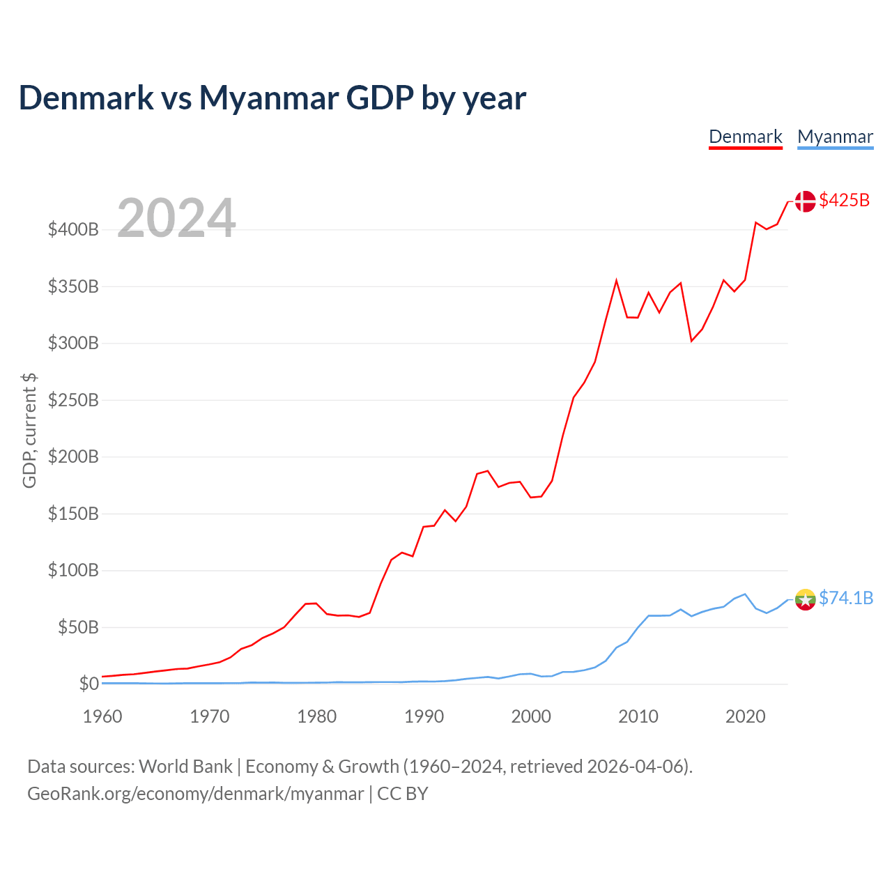 Denmark has a GDP of $425B compared to $74.1B for Myanmar, ranking 37/197 and 85/197 by economy size, respectively.