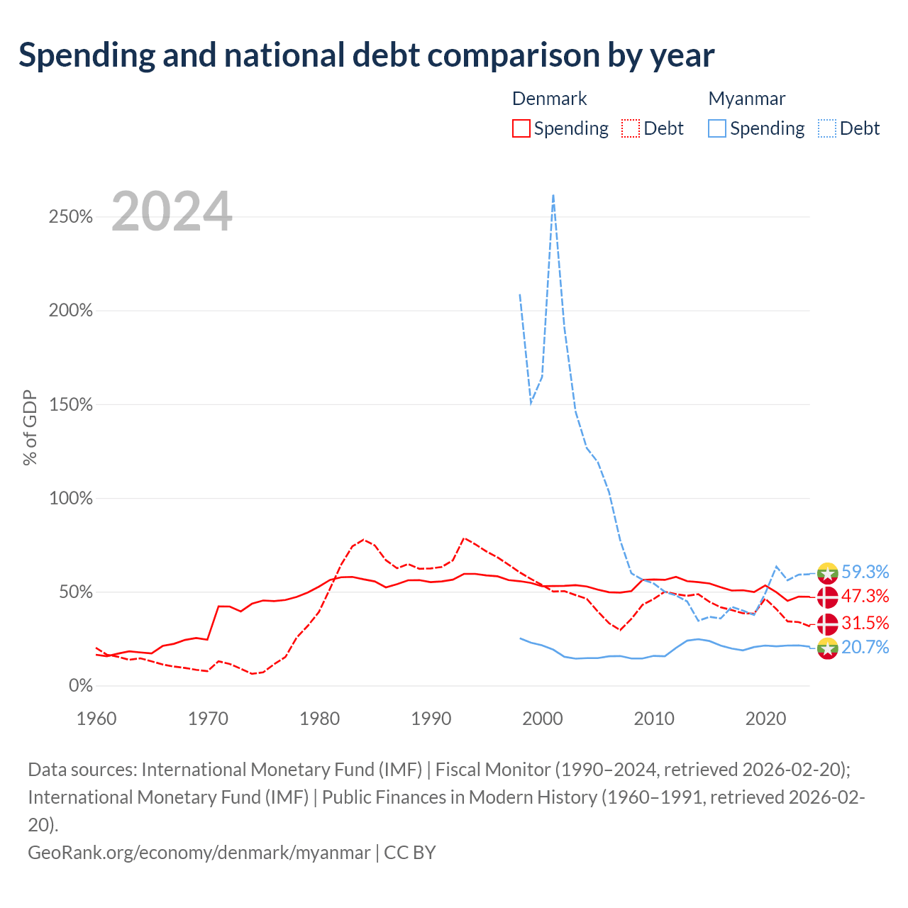 Denmark has $134B in government debt (31.5% of GDP), compared to $44B (59.3% of GDP) in Myanmar.