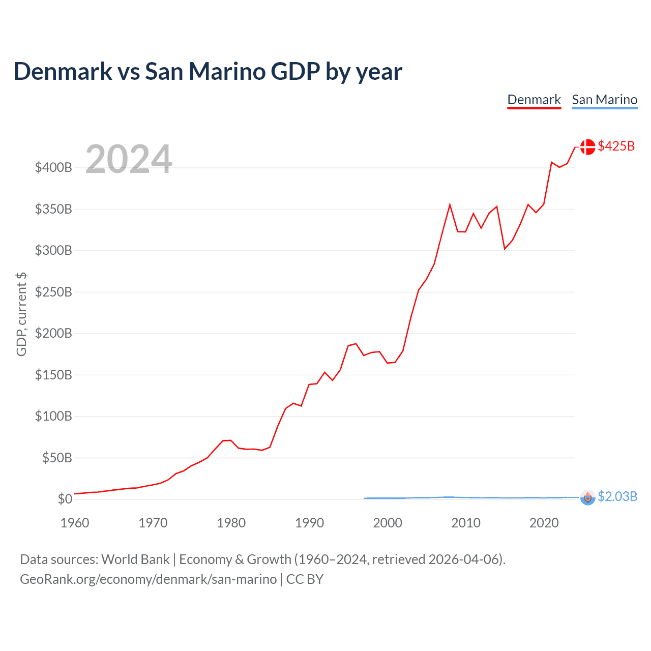 Denmark has a GDP of $425B compared to $2.03B for San Marino, ranking 37/197 and 180/197 by economy size, respectively.