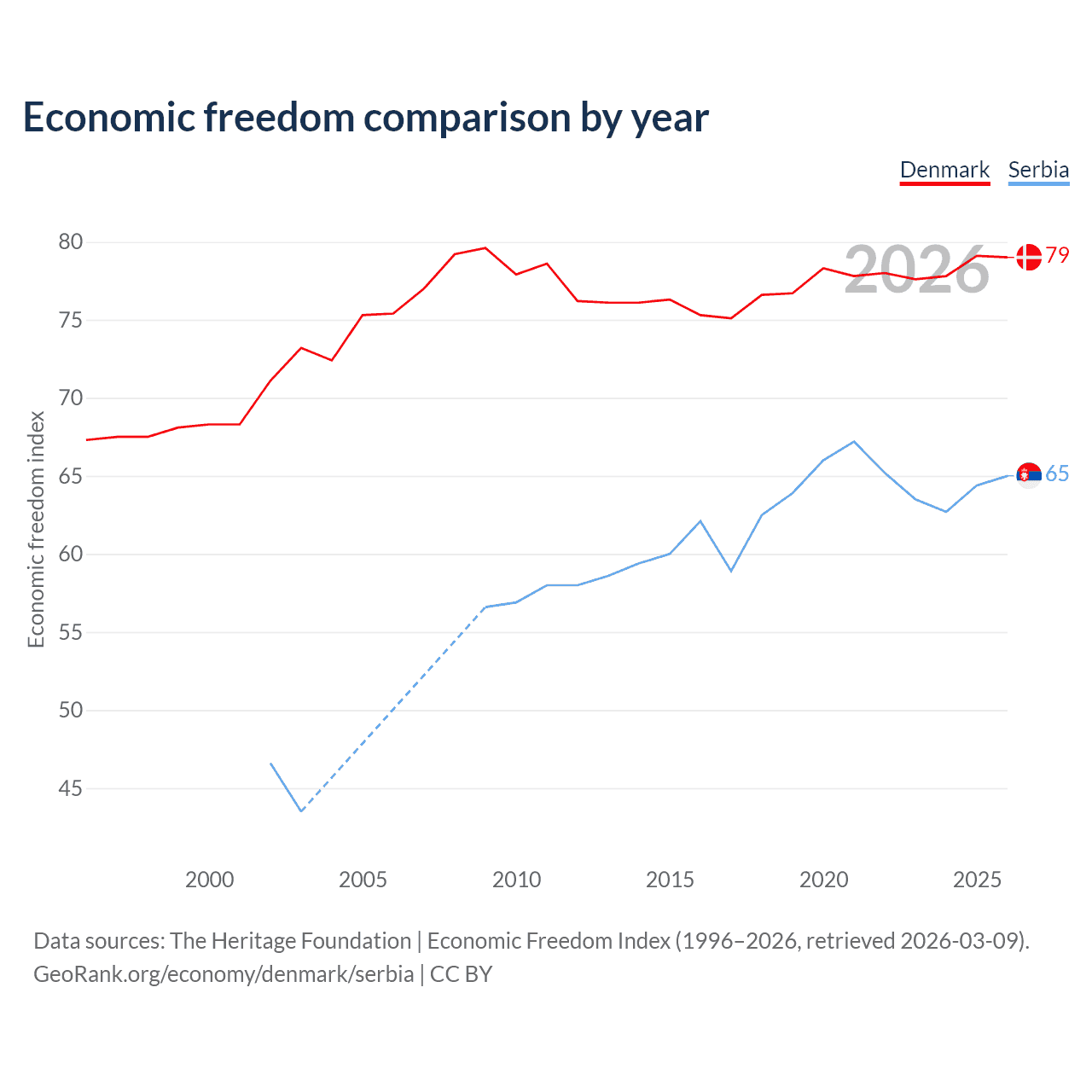 The Economic Freedom Index for Denmark is 79, ranking 8/197, compared to 65 for Serbia, ranking 68/197. The chart above displays a comparison of annual changes in economic freedom indexes.