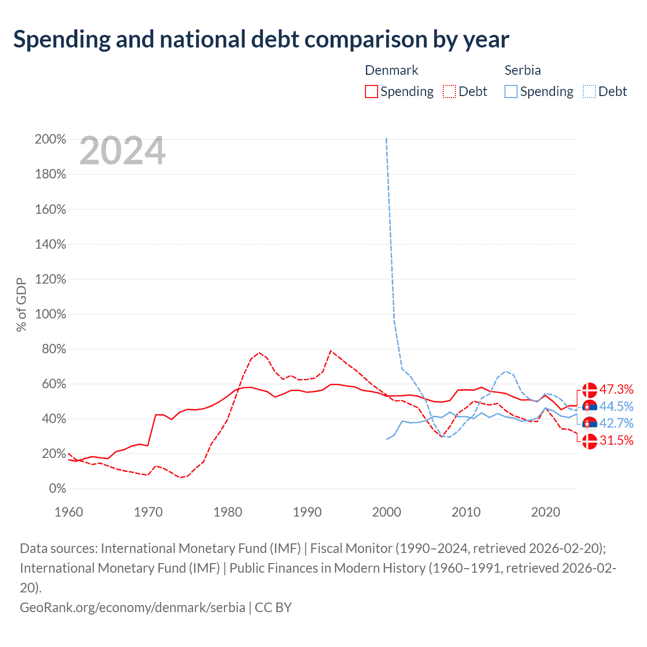 Denmark has $134B in government debt (31.5% of GDP), compared to $40.1B (44.5% of GDP) in Serbia.