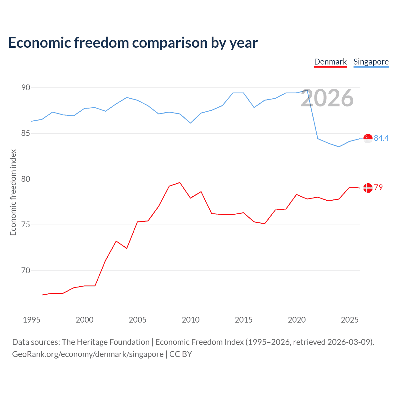 The Economic Freedom Index for Denmark is 79, ranking 8/197, compared to 84.4 for Singapore, ranking 1/197. The chart above displays a comparison of annual changes in economic freedom indexes.