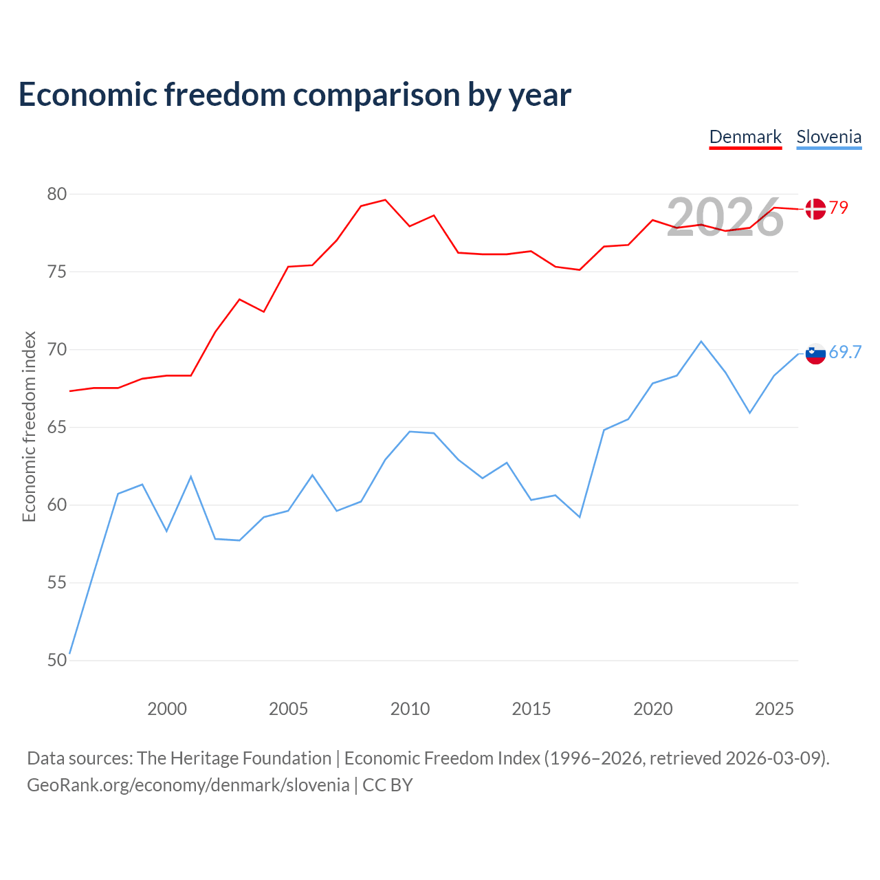 The Economic Freedom Index for Denmark is 79, ranking 8/197, compared to 69.7 for Slovenia, ranking 40/197. The chart above displays a comparison of annual changes in economic freedom indexes.