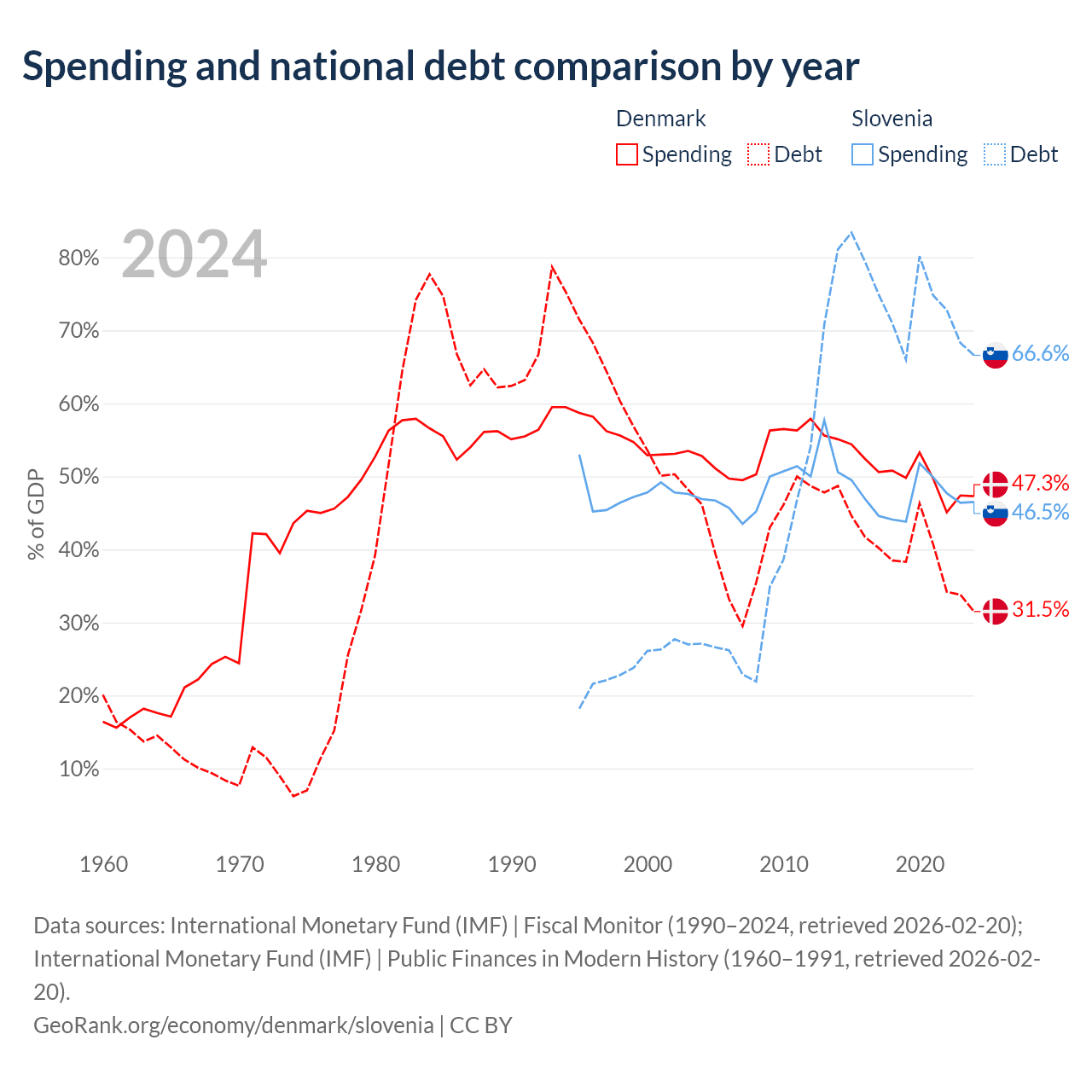Denmark has $134B in government debt (31.5% of GDP), compared to $48.6B (66.6% of GDP) in Slovenia.