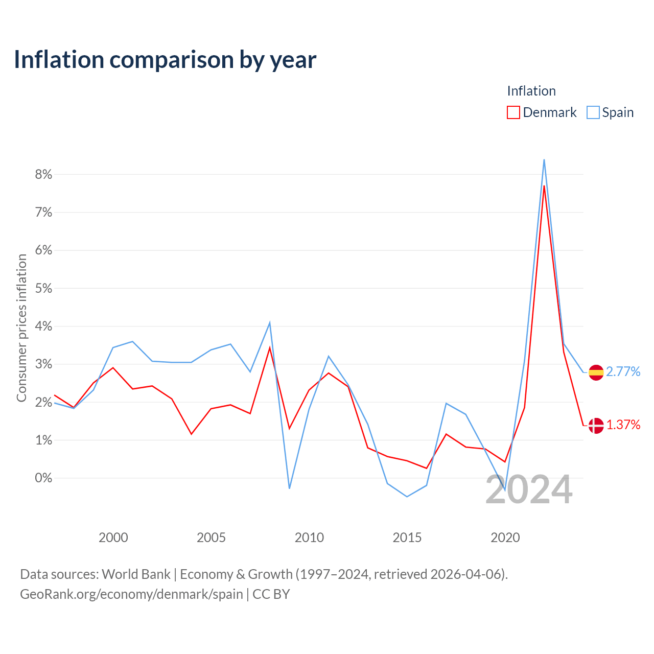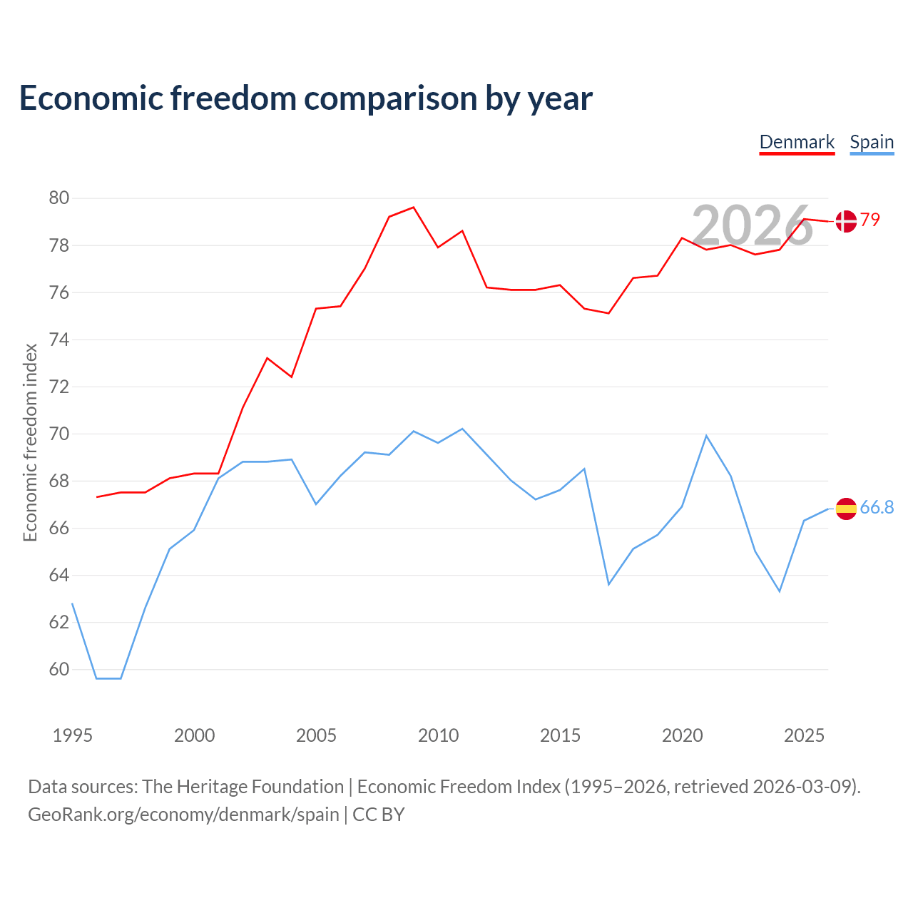The Economic Freedom Index for Denmark is 79, ranking 8/197, compared to 66.8 for Spain, ranking 59/197. The chart above displays a comparison of annual changes in economic freedom indexes.