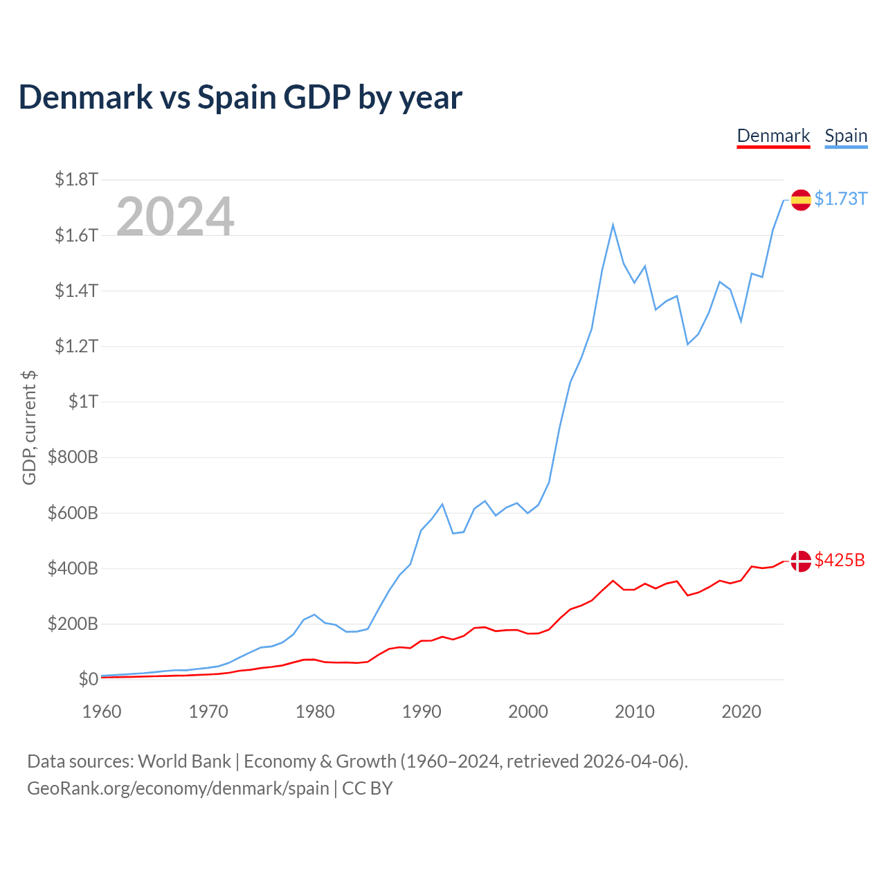 Denmark has a GDP of $425B compared to $1.73T for Spain, ranking 37/197 and 15/197 by economy size, respectively.
