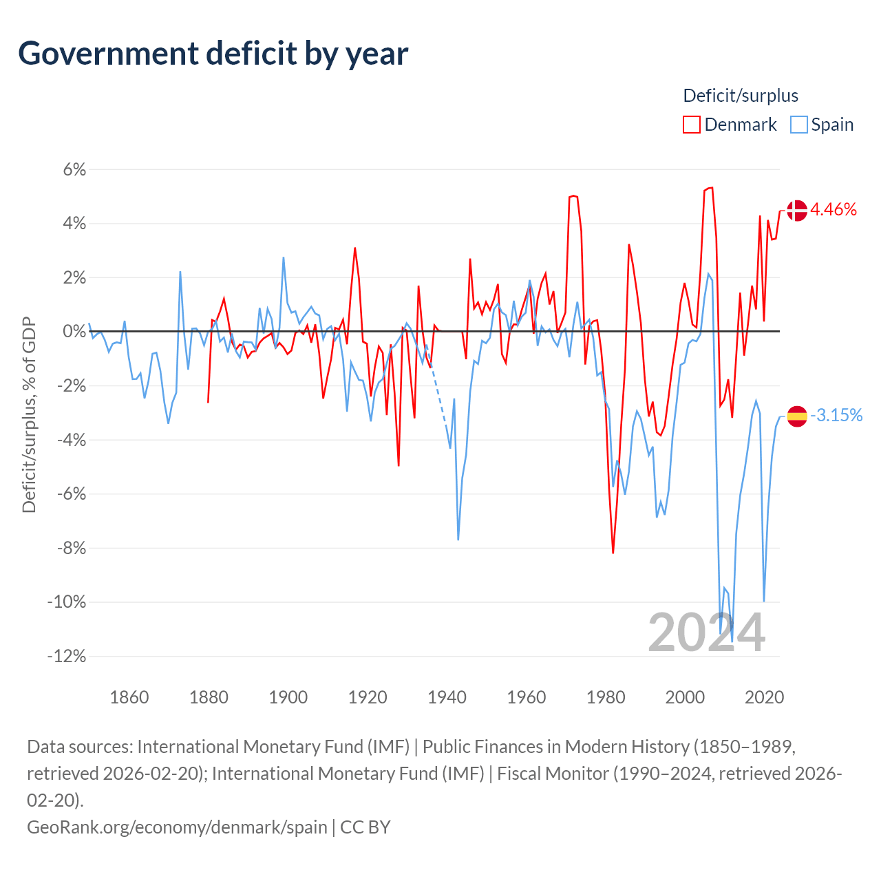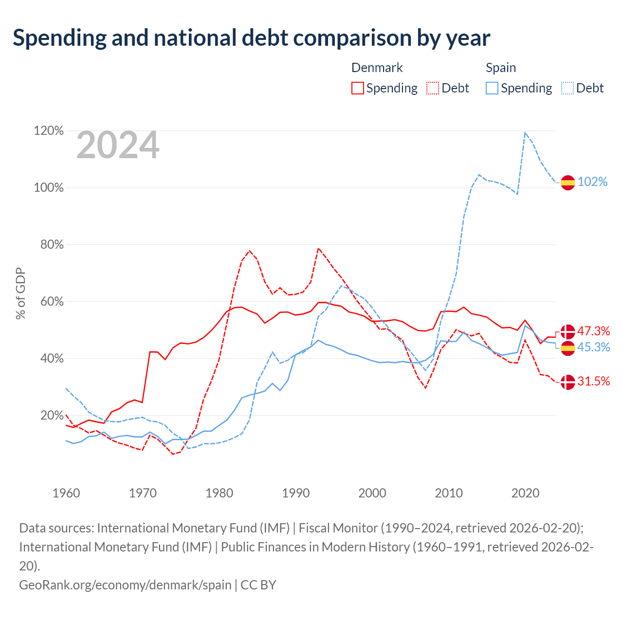 Denmark has $134B in government debt (31.5% of GDP), compared to $1.75T (101.6% of GDP) in Spain.