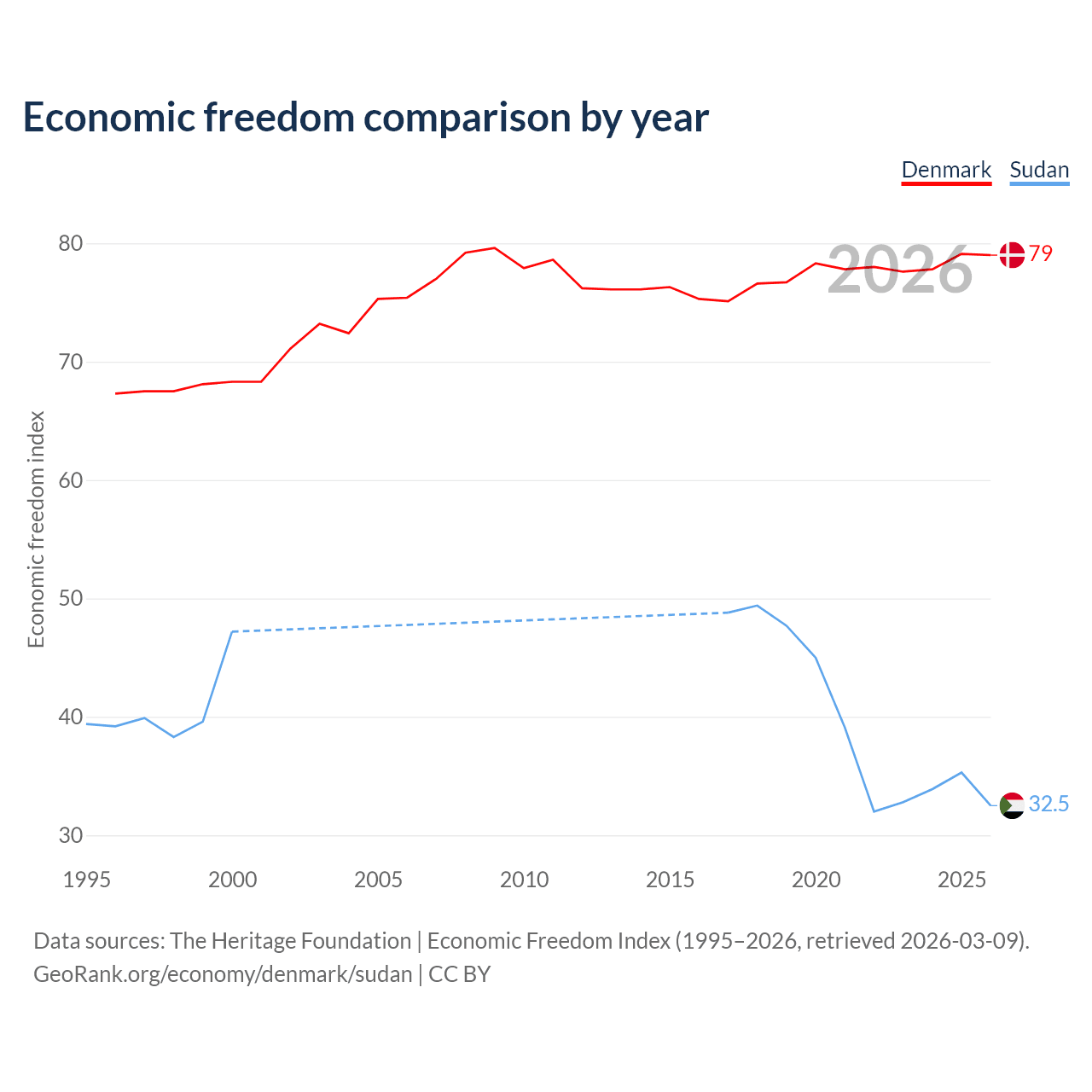 The Economic Freedom Index for Denmark is 79, ranking 8/197, compared to 32.5 for Sudan, ranking 191/197. The chart above displays a comparison of annual changes in economic freedom indexes.