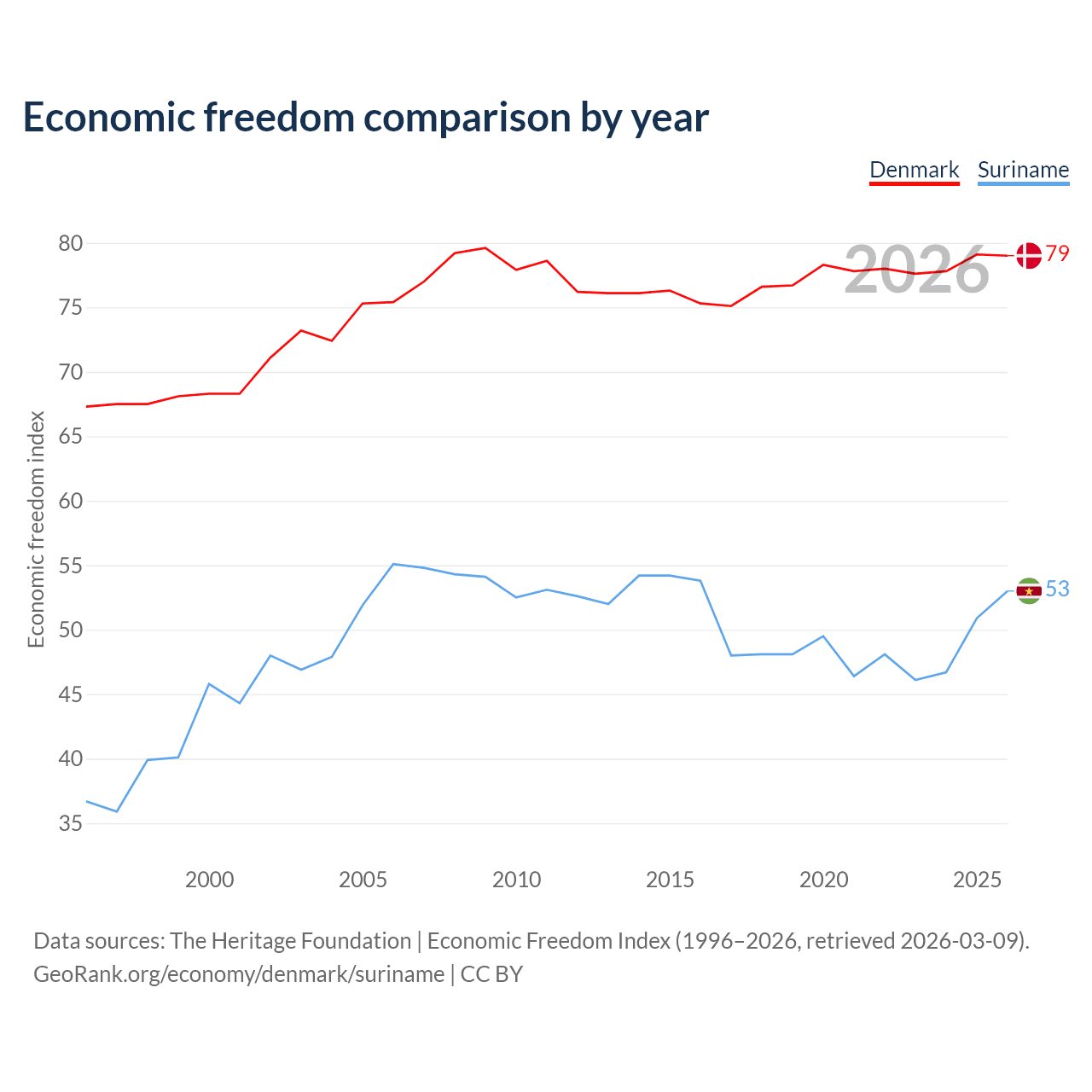 The Economic Freedom Index for Denmark is 79, ranking 8/197, compared to 53 for Suriname, ranking 143/197. The chart above displays a comparison of annual changes in economic freedom indexes.