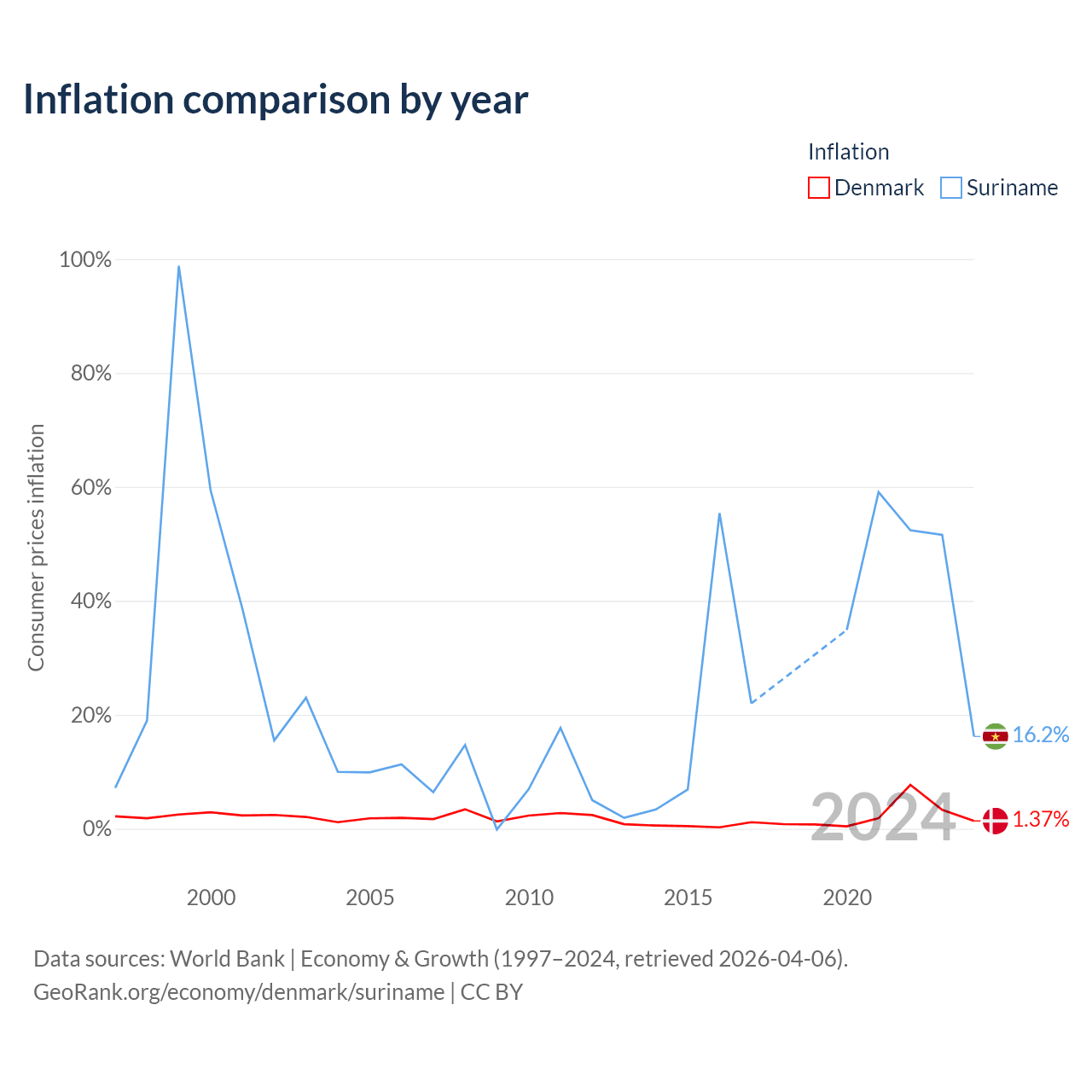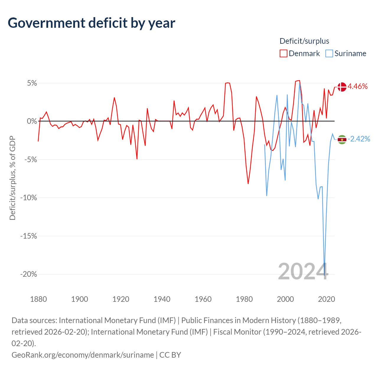 Denmark has a GDP of $425B compared to $4.42B for Suriname, ranking 37/197 and 164/197 by economy size, respectively.