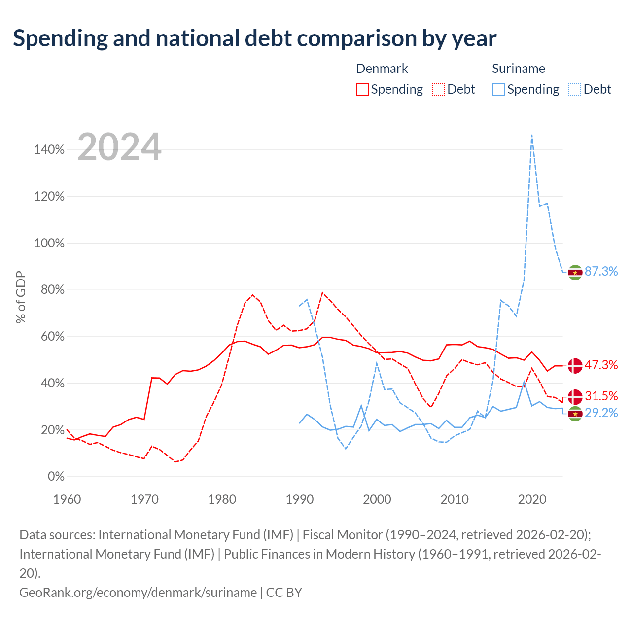 Denmark has $134B in government debt (31.5% of GDP), compared to $3.86B (87.3% of GDP) in Suriname.