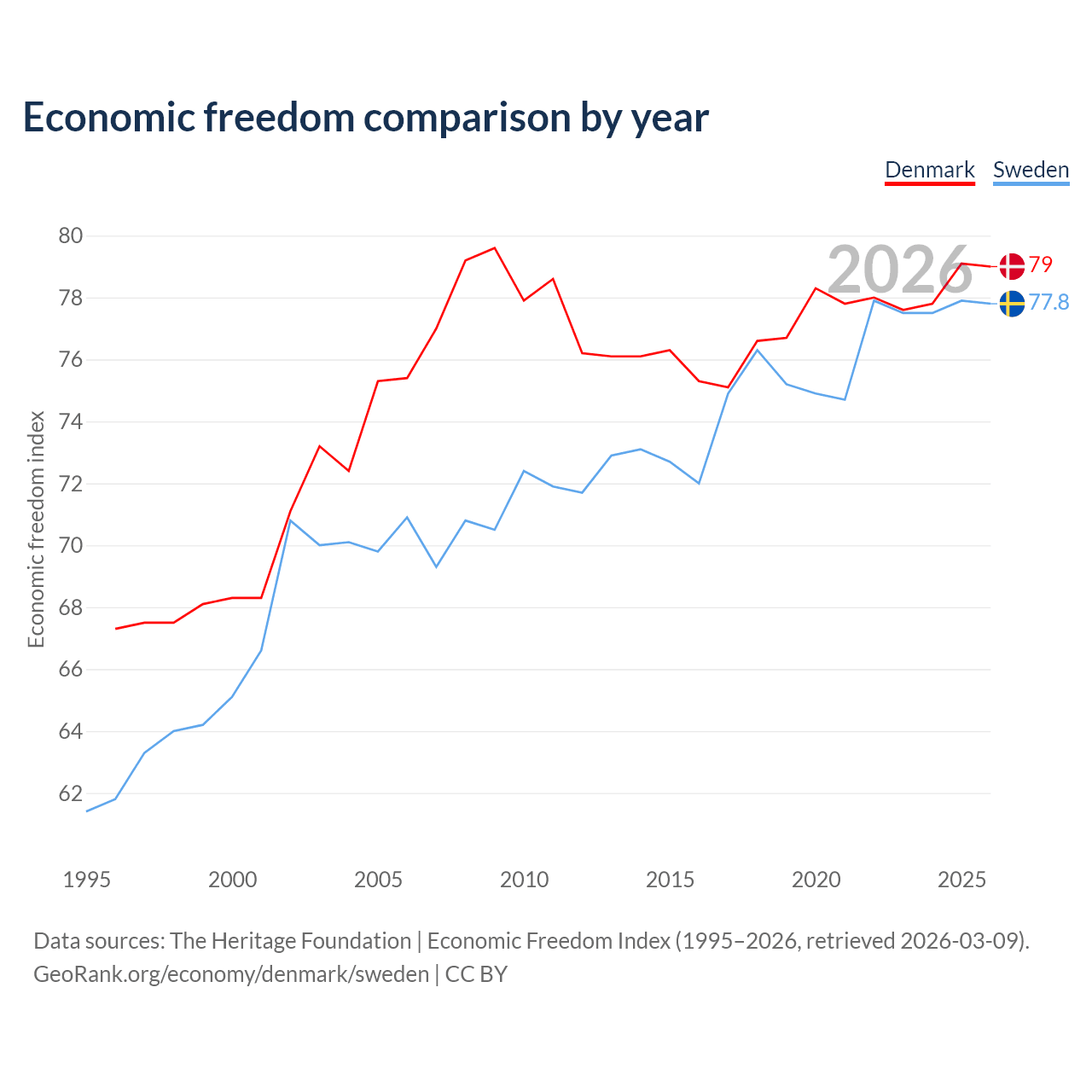 The Economic Freedom Index for Denmark is 79, ranking 8/197, compared to 77.8 for Sweden, ranking 14/197. The chart above displays a comparison of annual changes in economic freedom indexes.