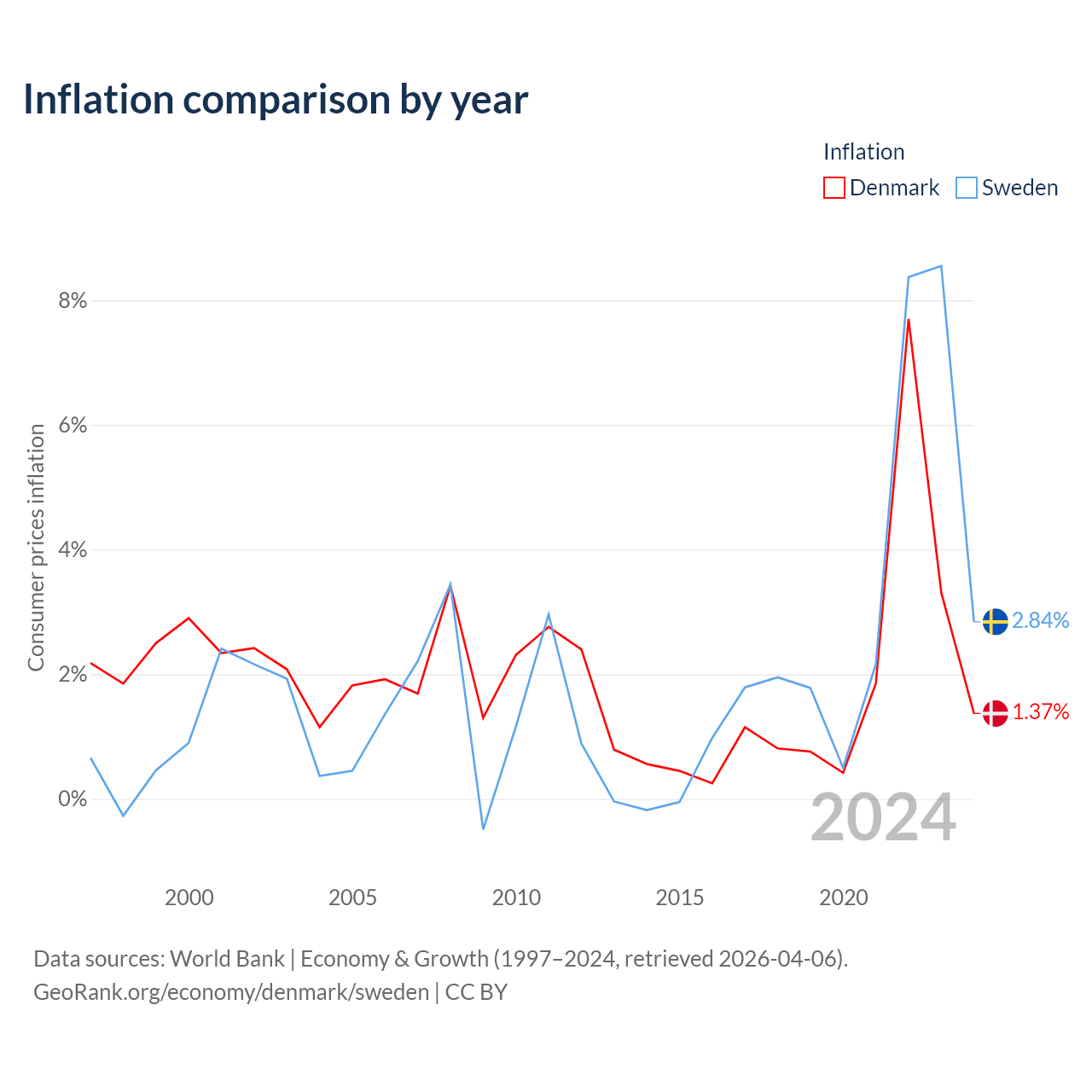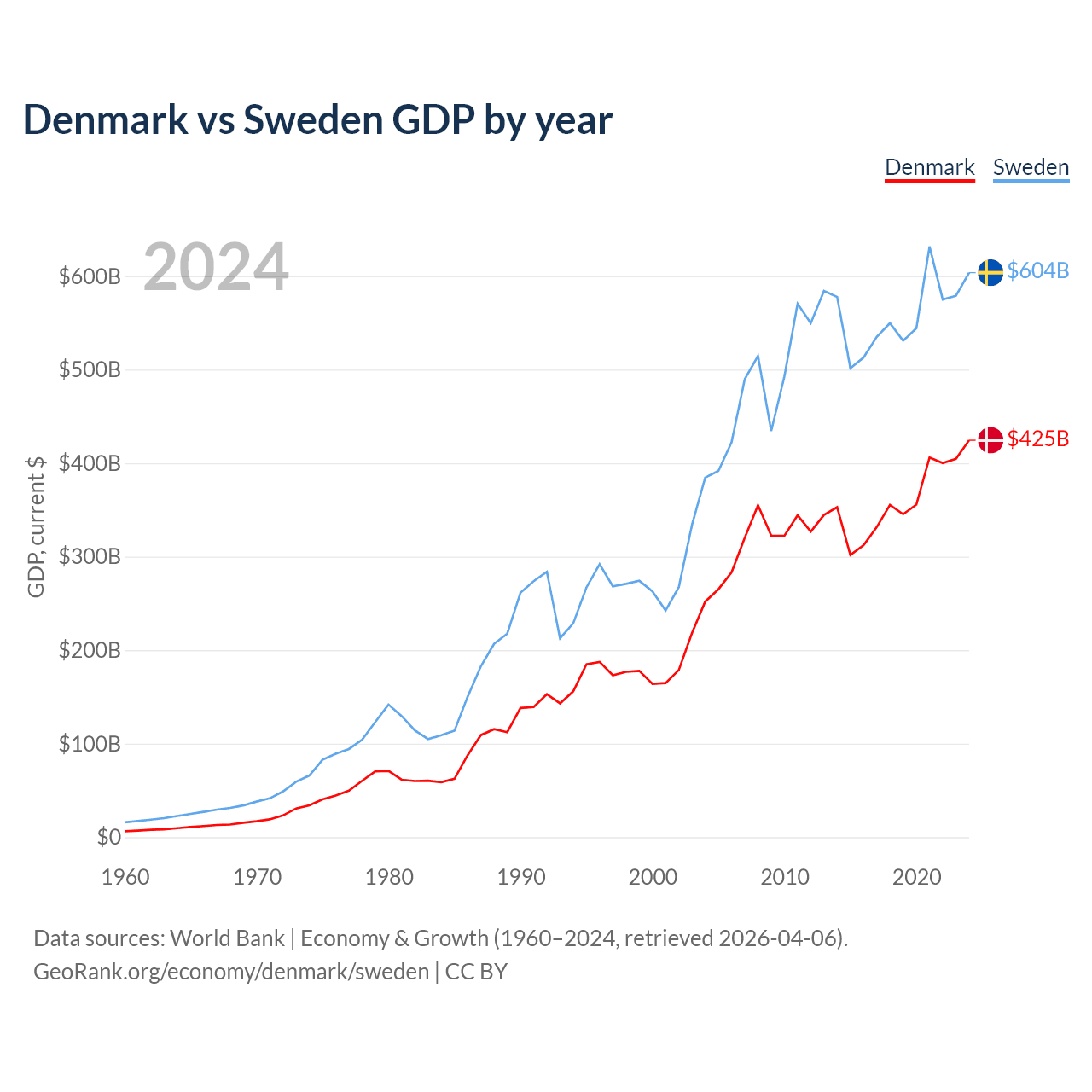 Denmark has a GDP of $425B compared to $604B for Sweden, ranking 37/197 and 26/197 by economy size, respectively.