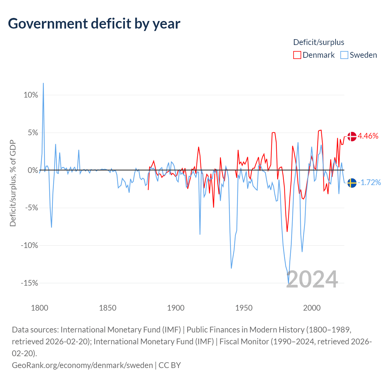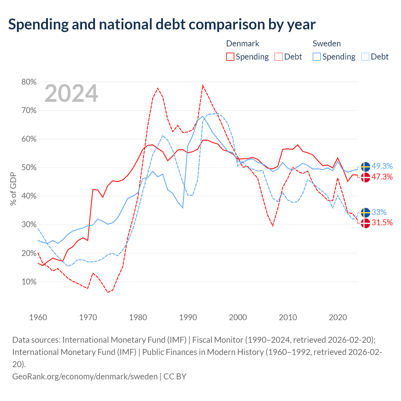 Denmark has $134B in government debt (31.5% of GDP), compared to $199B (33% of GDP) in Sweden.