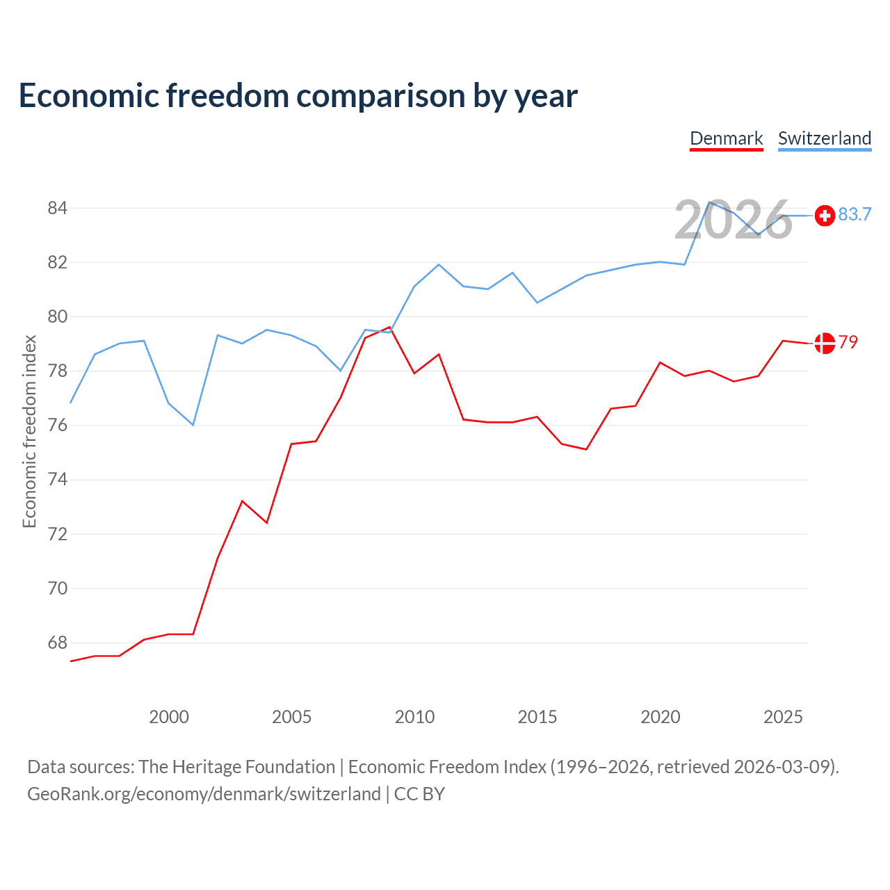 The Economic Freedom Index for Denmark is 79, ranking 8/197, compared to 83.7 for Switzerland, ranking 2/197. The chart above displays a comparison of annual changes in economic freedom indexes.