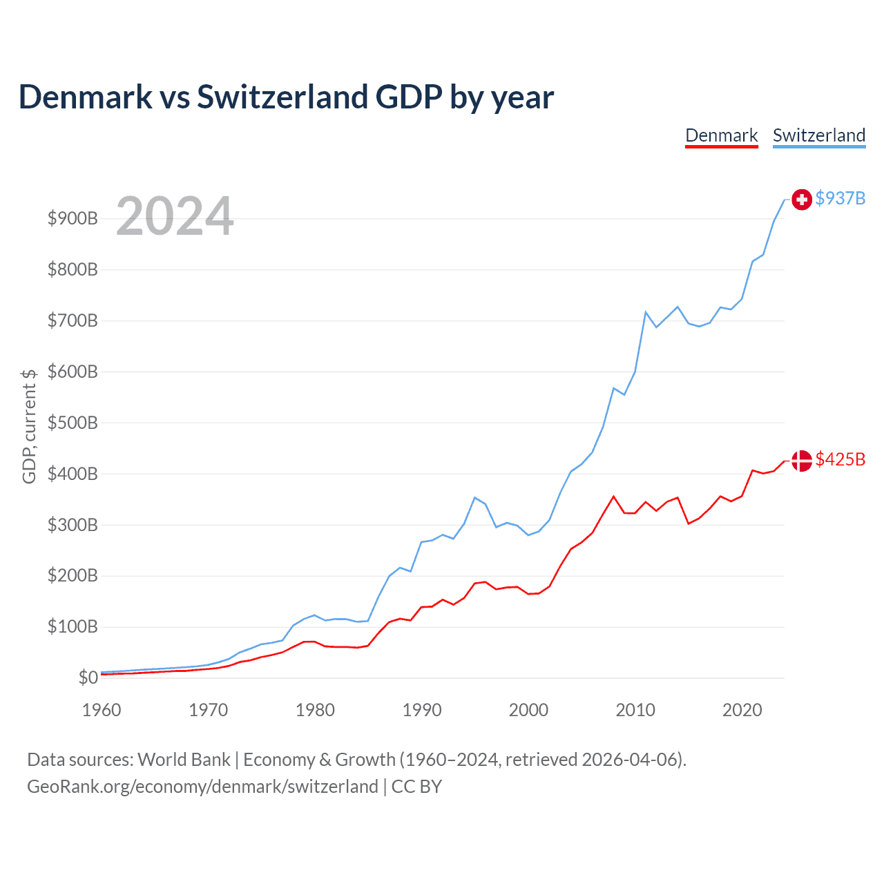 Denmark vs Switzerland GDP by year