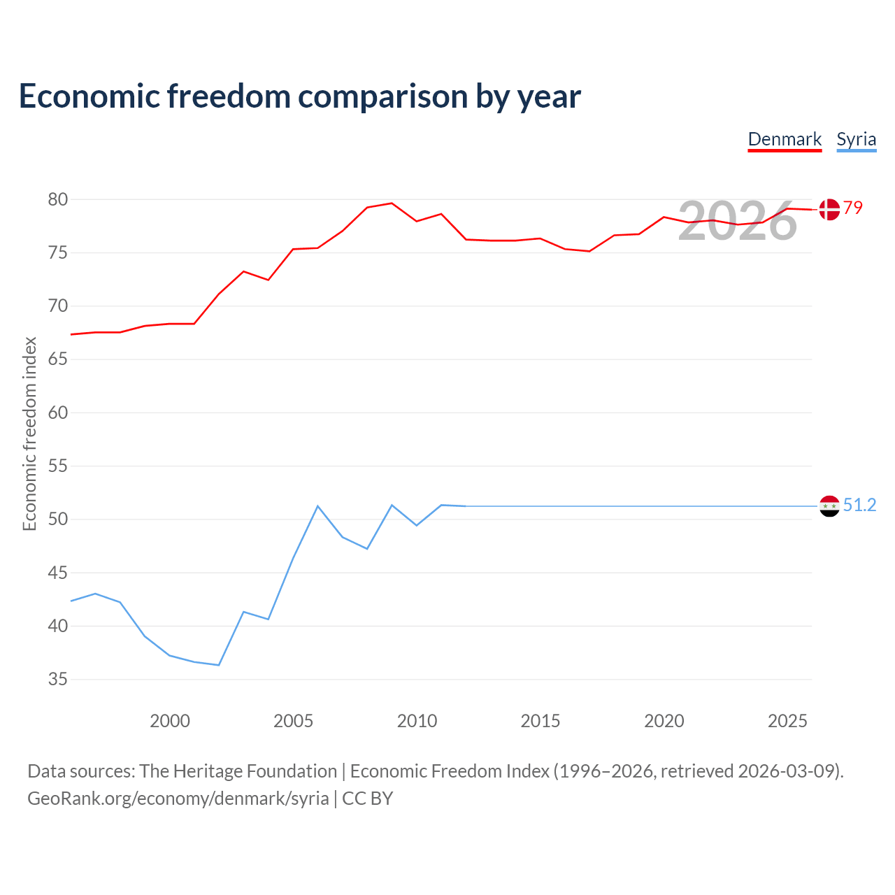 The Economic Freedom Index for Denmark is 79, ranking 8/197, compared to 51.2 for Syria, ranking 155/197. The chart above displays a comparison of annual changes in economic freedom indexes.