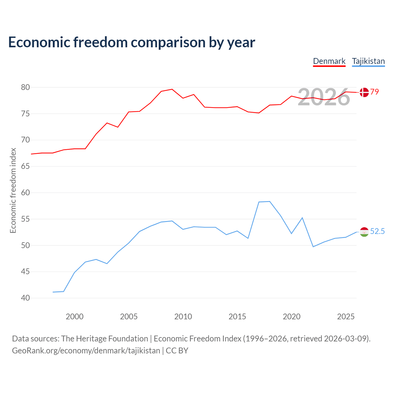 The Economic Freedom Index for Denmark is 79, ranking 8/197, compared to 52.5 for Tajikistan, ranking 147/197. The chart above displays a comparison of annual changes in economic freedom indexes.
