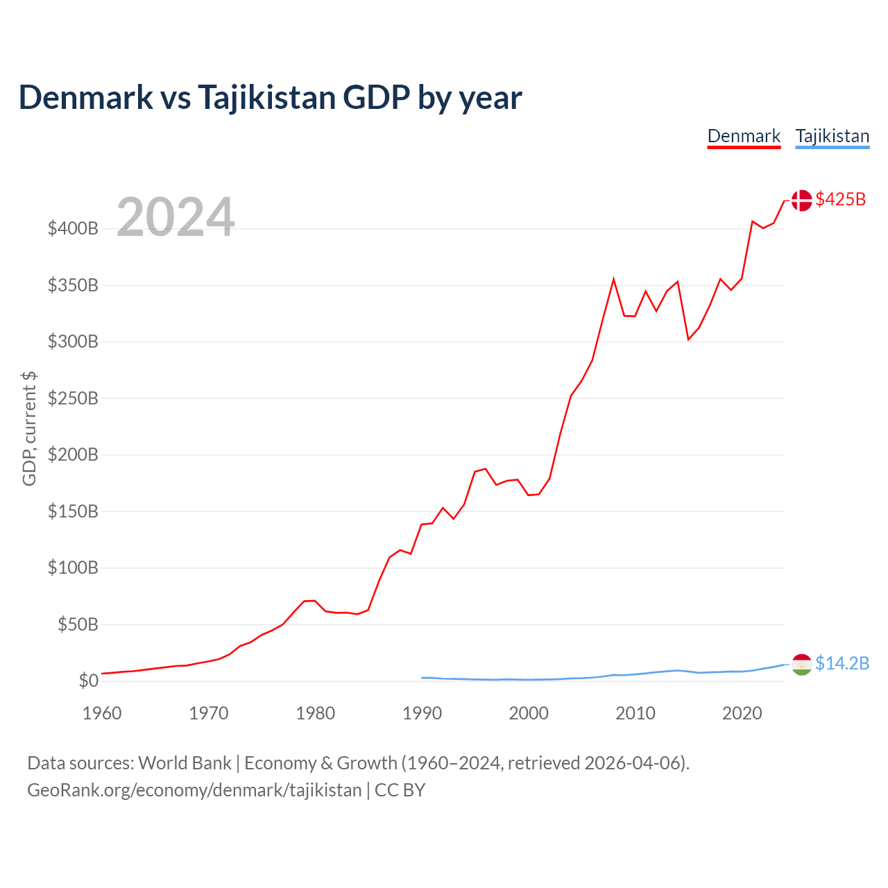 Denmark has a GDP of $425B compared to $14.2B for Tajikistan, ranking 37/197 and 145/197 by economy size, respectively.