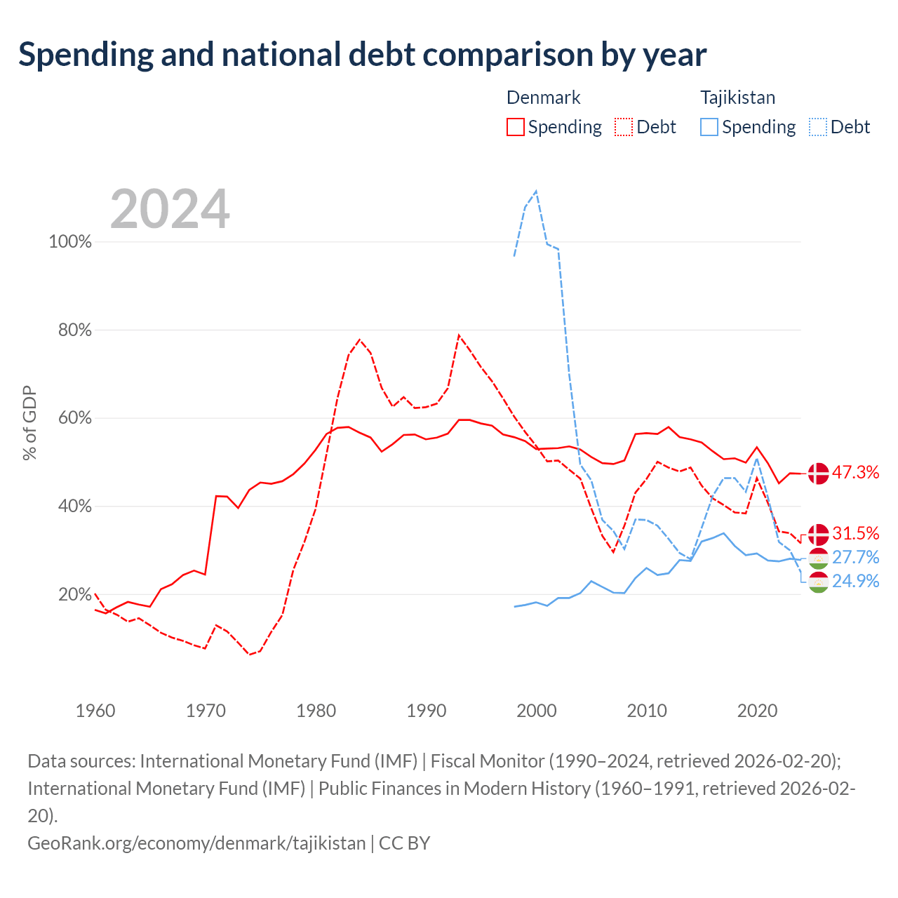 Denmark has $134B in government debt (31.5% of GDP), compared to $3.54B (24.9% of GDP) in Tajikistan.