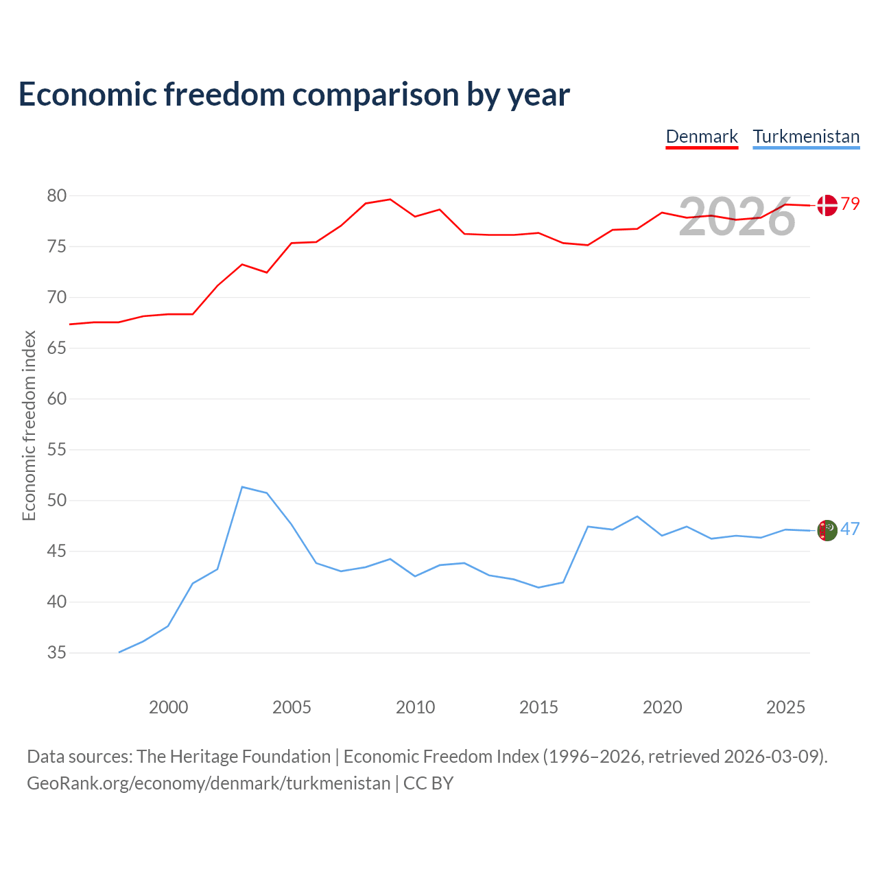The Economic Freedom Index for Denmark is 79, ranking 8/197, compared to 47 for Turkmenistan, ranking 177/197. The chart above displays a comparison of annual changes in economic freedom indexes.