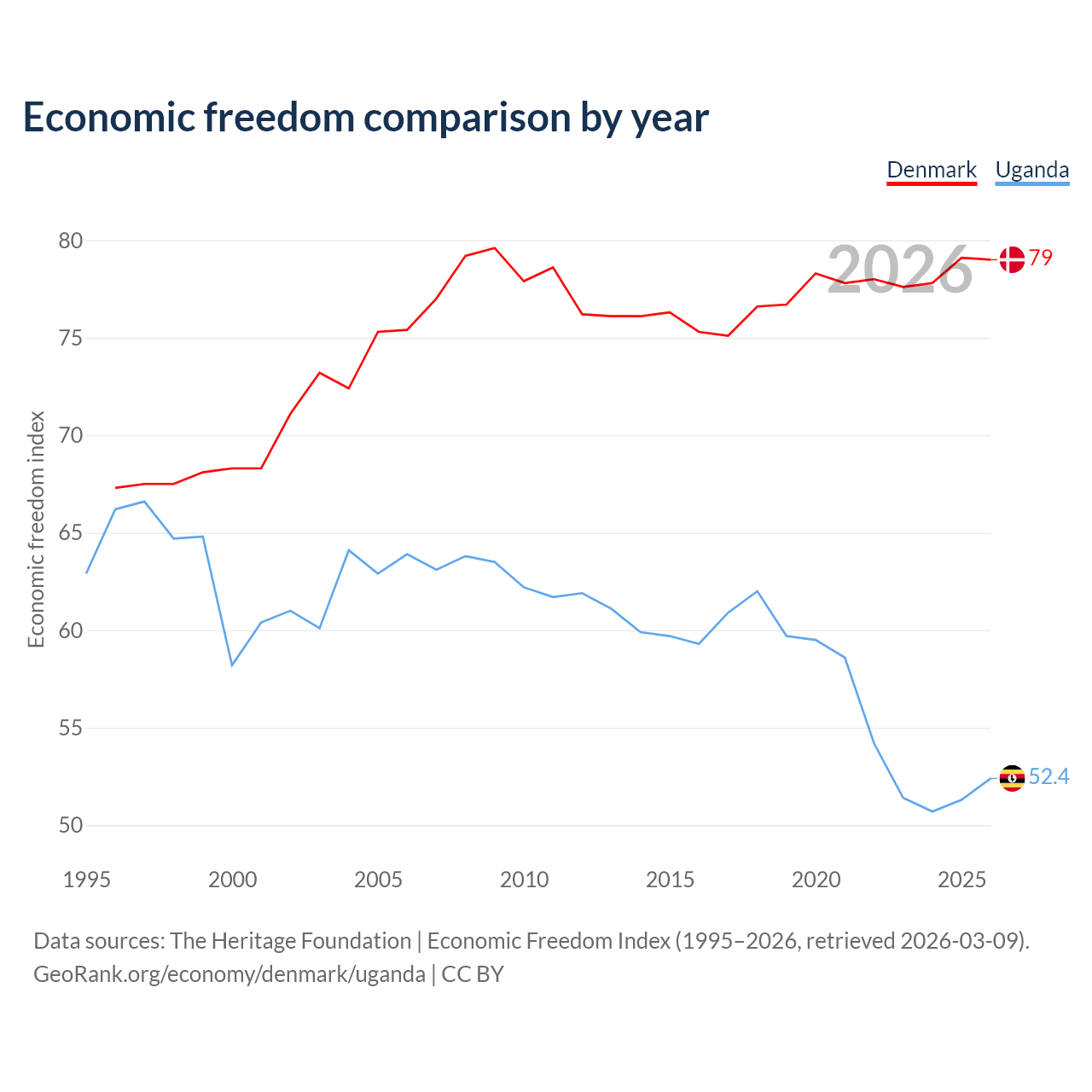 The Economic Freedom Index for Denmark is 79, ranking 8/197, compared to 52.4 for Uganda, ranking 149/197. The chart above displays a comparison of annual changes in economic freedom indexes.