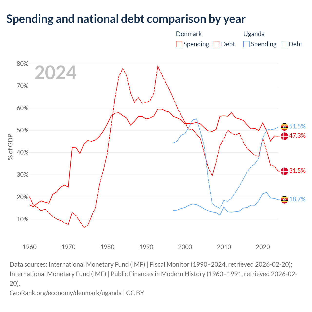 Denmark has $134B in government debt (31.5% of GDP), compared to $27.8B (51.5% of GDP) in Uganda.