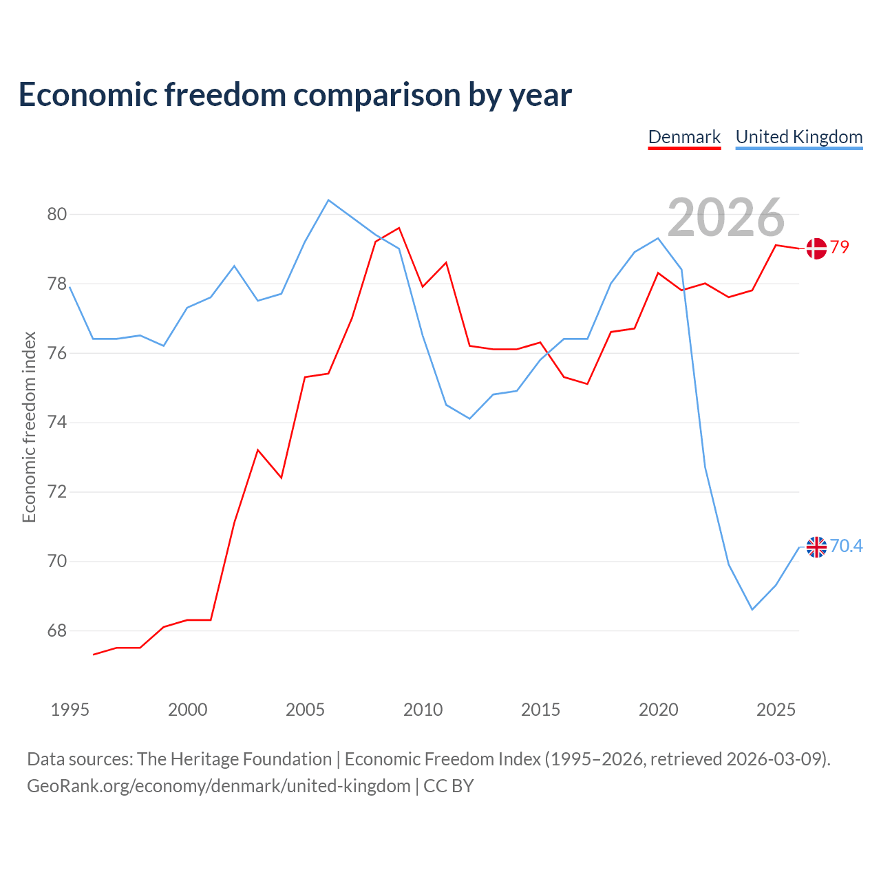 The Economic Freedom Index for Denmark is 79, ranking 8/197, compared to 70.4 for the United Kingdom, ranking 35/197. The chart above displays a comparison of annual changes in economic freedom indexes.