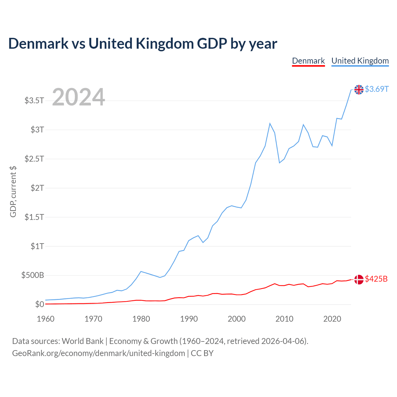 Denmark has a GDP of $425B compared to $3.69T for the United Kingdom, ranking 37/197 and 6/197 by economy size, respectively.