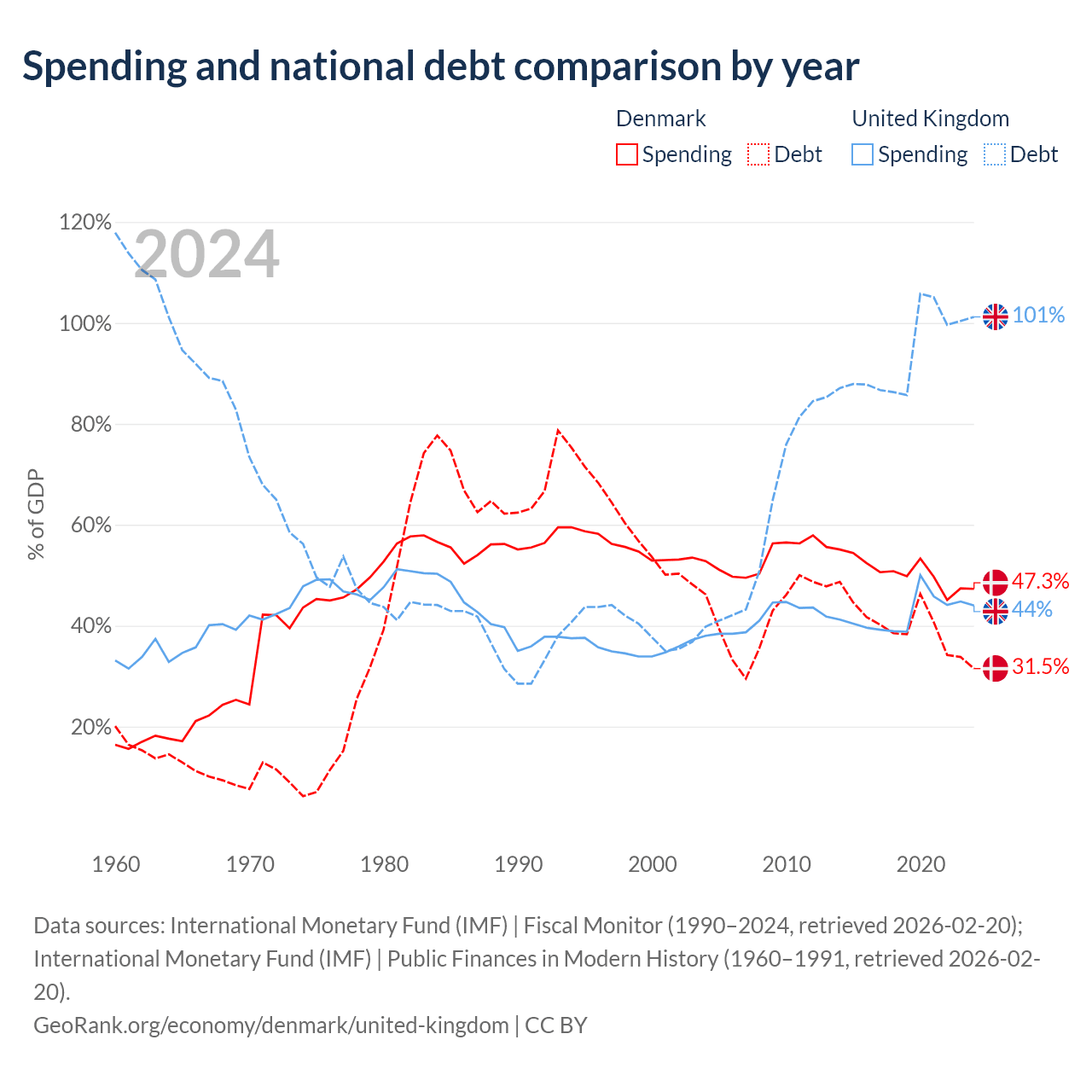 Denmark has $134B in government debt (31.5% of GDP), compared to $3.73T (101.2% of GDP) in the United Kingdom.